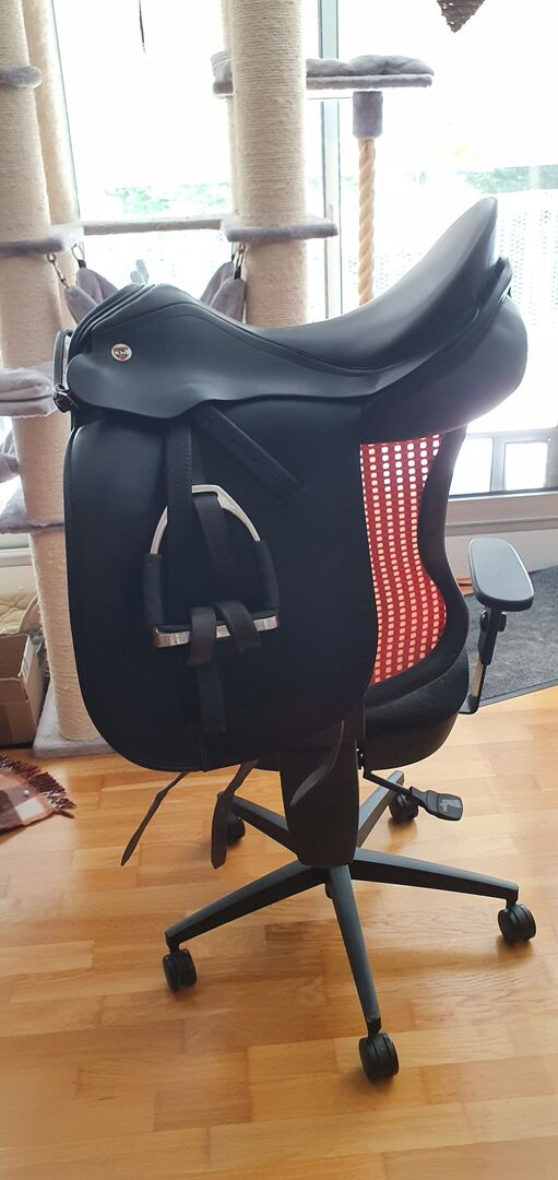 Siodło ujeżdżeniowe z wyposażeniem - Sprzedam bardzo dobrze zachowane czarne siodło ujeżdżeniowe firmy Karl Niedersüß z normalnymi śladami użytkowania widocznymi na zdjęciach. Siodło można indywidualnie regulować, siedzisko ma 45 cm, jako wyposażenie dodatkowe dołączone są również skóry na strzemiona, strzemiona ochronne i krótkie pasy w różnych rozmiarach (65 cm, 70 cm lub 75 cm). W razie potrzeby można również dołączyć ściereczkę do siodła lub koc pod siodło. Jazda w siodle, które jest bardzo wygodne, sprawiła mi wiele przyjemności. Był on osadzony na ogierze warmblood o wysokości 1,68 m. Siodło można oddać do zakładu siodlarskiego i wypróbować, a cena sprzedaży stanowi depozyt.