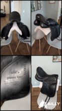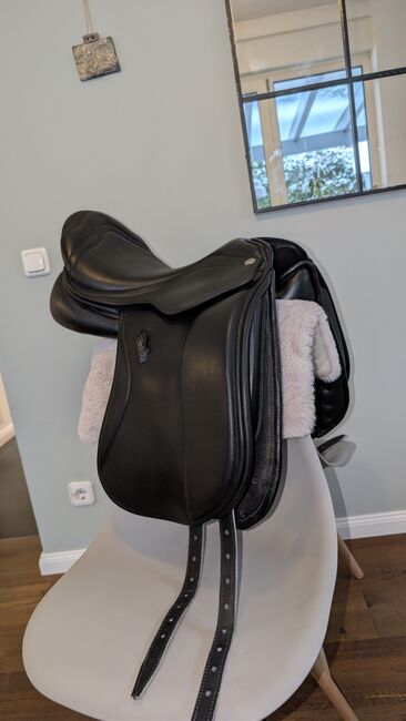 Siodło zostało kupione około rok temu i było na moim koniu przez maksymalnie trzy miesiące. Jest więc praktycznie jak nowe. Oryginalna faktura na 3,500 € jest dostępna i może być załączona.