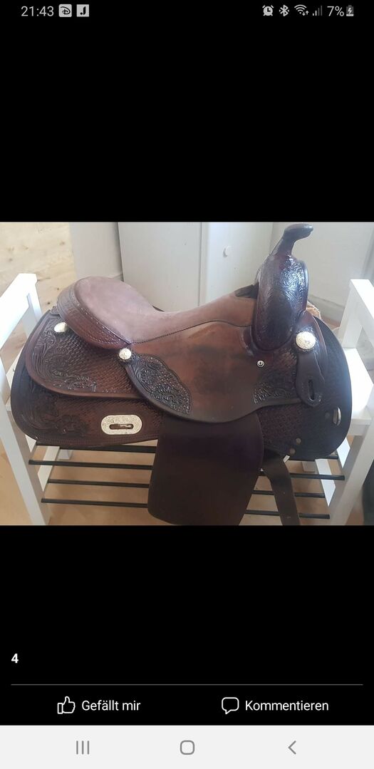 Siodło western 02 komora 16 cali Deuber - Sprzedaję moje ukochane siodło western z 2 popręgami i rozmiarem 16 cali. Może być dostarczony w komplecie z pasem, podkładką i strzemionami. Siedzenie jest świeżo po renowacji, wszystkie konchy zostały wymienione na konchy z dżetów, zamontowano pierścienie D (można je łatwo odkręcić). Jest bardzo wygodny i dobrze utrzymany. Niestety już na nas nie pasuje, ale jest to flexbaum, które może być dopasowane przez rymarza. Wymiary są podane na zdjęciach.