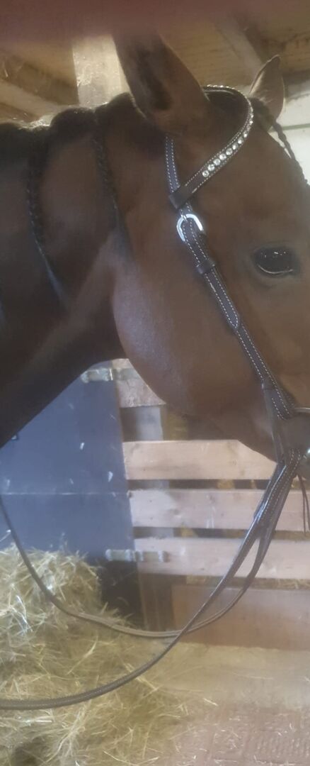 W zestawie znajdują się następujące elementy: - Karabińczyk z jednym uchem i wodze w pasującym odcieniu brązu oraz brokatowa tylna pętla (2x używane, 90€). - Burioni Westernpad (2x używany, nowa cena 85 €) - a także używany, ale funkcjonalny popręg i dobrze używana podkładka.