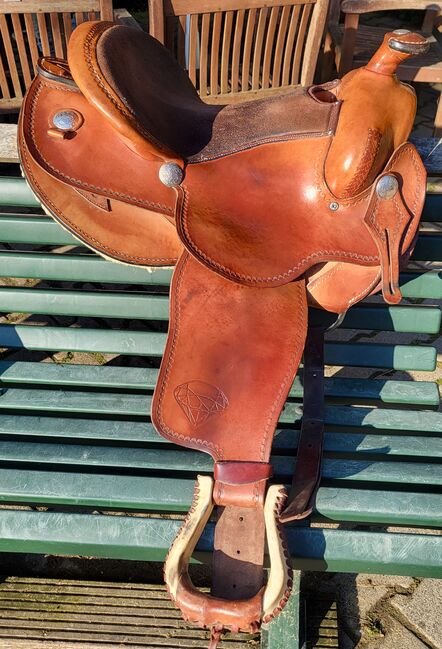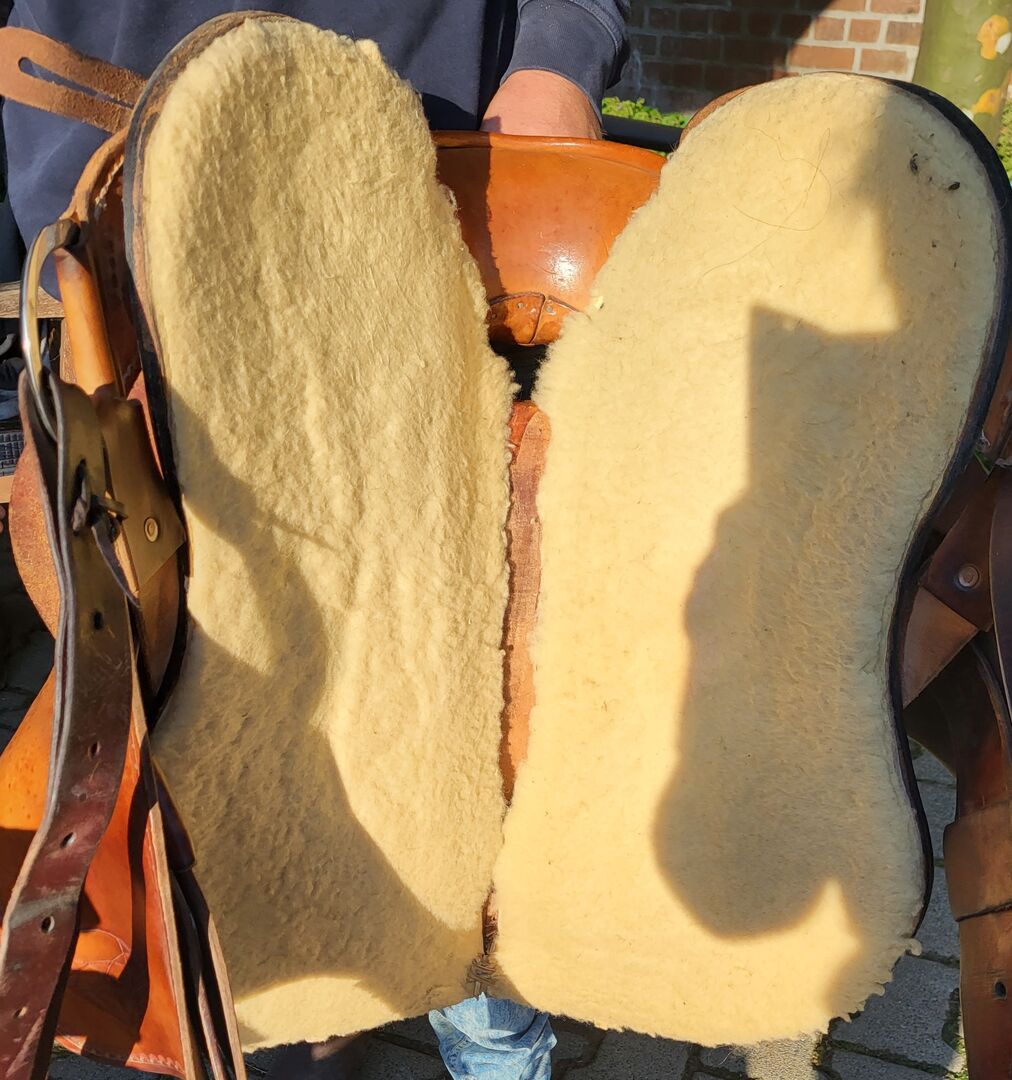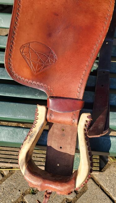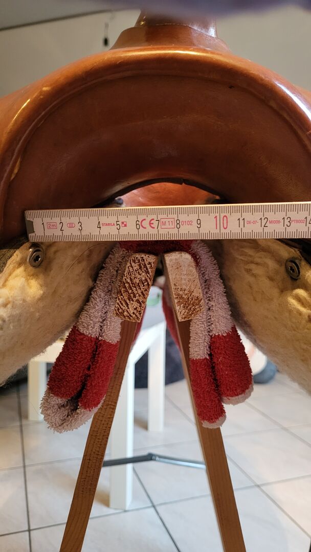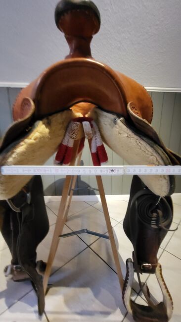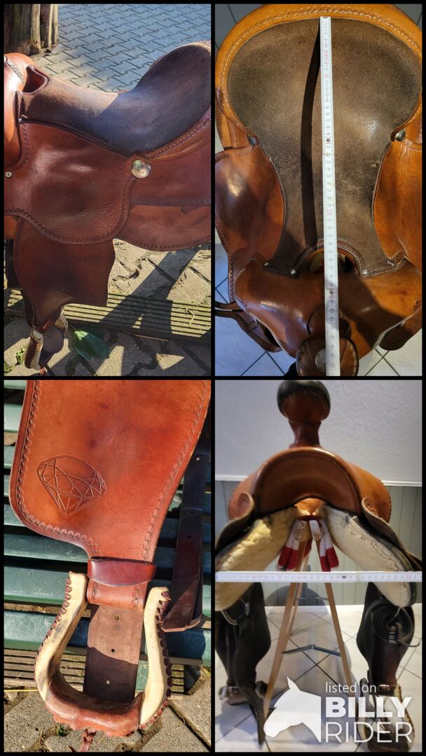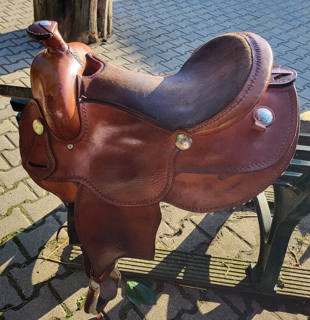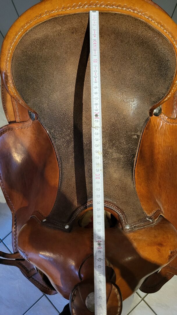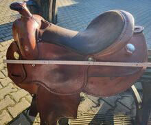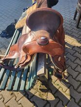 Siodło western brązowe wąskie krótkie - Sprzedam używane siodło western. Odpowiednie dla wąskich koni i krótkich grzbietów Na zdjęciach widać ślady użytkowania i wymiary.