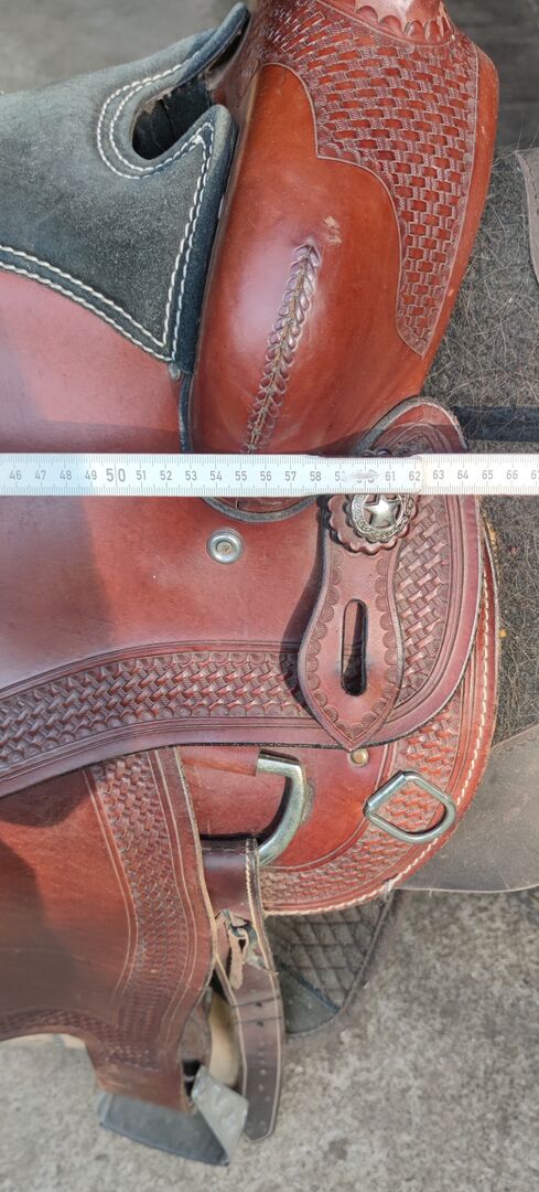 Siodło western - szerokie - warmblood - Sprzedaję moje westernowe siodło, ponieważ mój koń przechodzi na emeryturę. Siodło było na warmblooda o wzroście 1,80 metra. Wymiary na zdjęciach :)