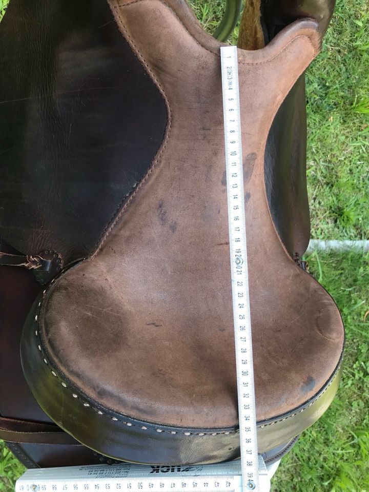 Siodło westernowe 16 cali - Sprzedaję moje ukochane westernowe siodło "semi Quarter" bez popręgu, ponieważ nie pasuje już na mojego obecnego konia. Widoczne są ślady użytkowania. Siodło zostało wykonane w 2006 roku i było dopasowane do konia arabskiego i jest wykonane na zamówienie. Jest również wykonane w całości z drewna. Rozmiar siedziska 16 cali Waga: około 12 kg Więcej szczegółów na zdjęciach lub na życzenie. Możliwa wysyłka, ale preferowany odbiór w 40223 lub 53225