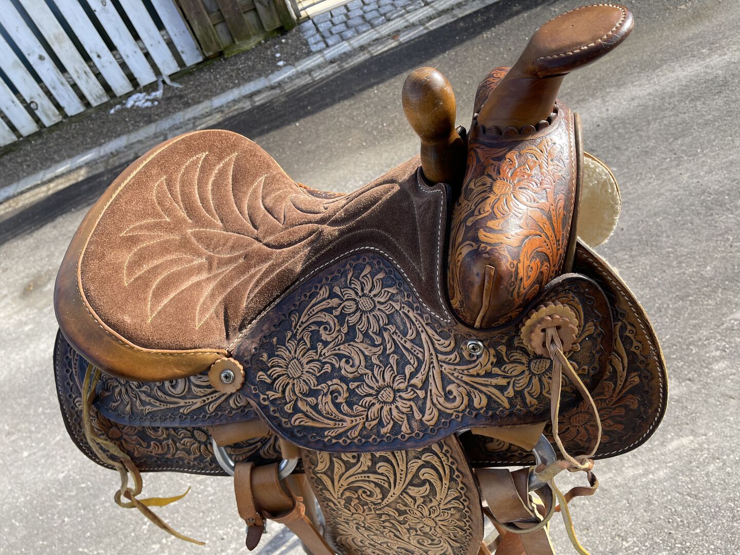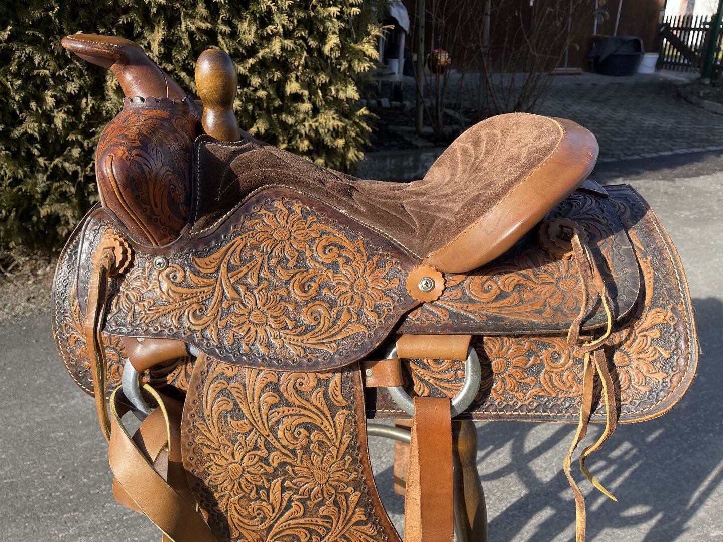 Siodło westernowe - Sprzedaję piękne amerykańskie siodło westernowe w doskonałym stanie. Niestety, jest za wąski dla mojego konia i dlatego odchodzi (choć naprawdę stanowi dobrą ozdobę).