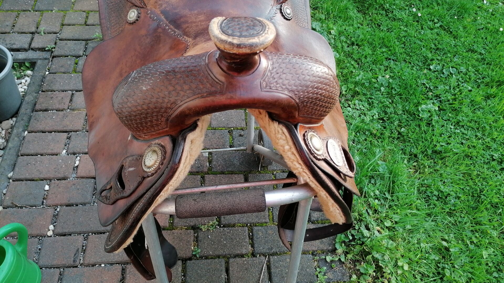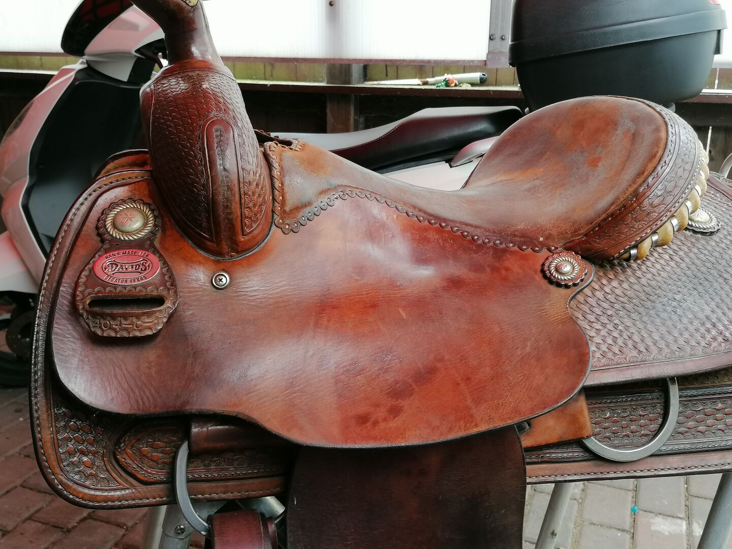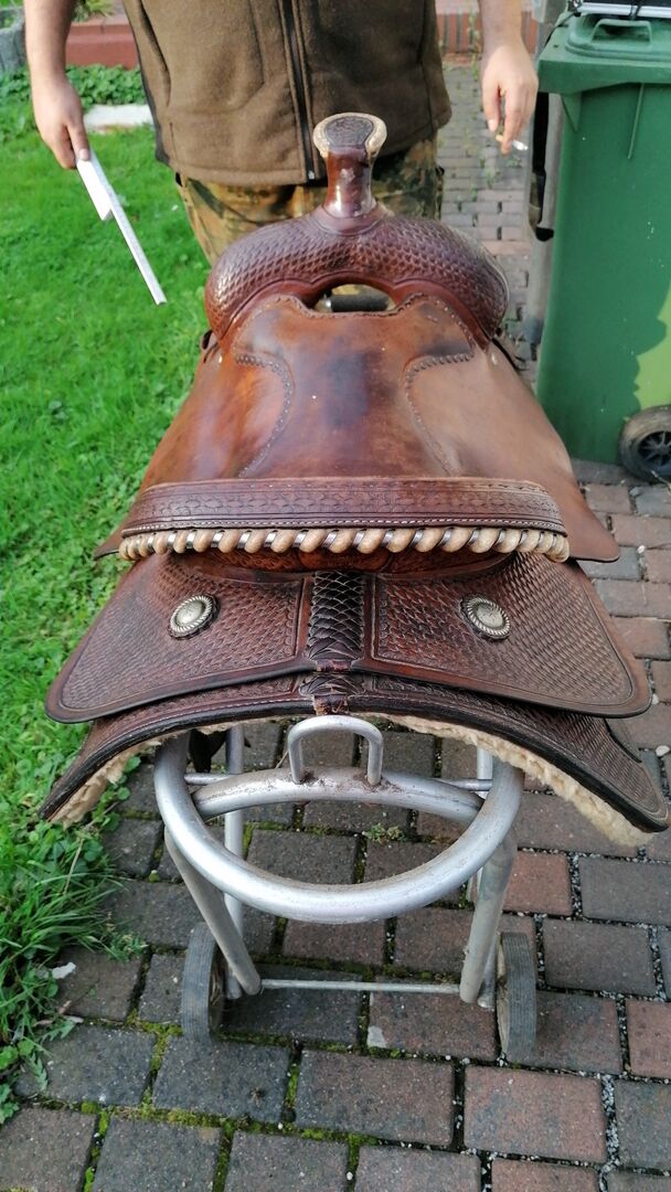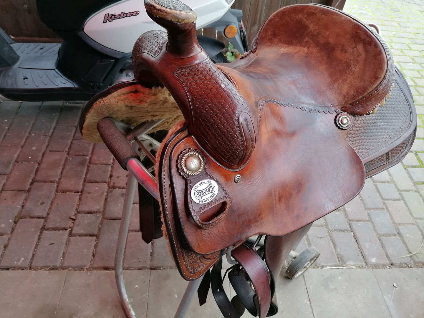 Siodło westernowe - Prawdziwy rarytas! Używane siodło robocze od Davida (Star of Texas) kilka śladów użytkowania, ale w dobrym stanie - niestety nie pasuje na mojego młodzieńca, w przeciwnym razie zatrzymałbym je dla siebie. Nadaje się dla wszystkich ras zachodnich w typie szerszym lub Haflinger i podobnych -, półpełna ćwiartka do pełnej ćwiartki, wahanie 54 cm, szerokość puślisk 36,5 cm, rozstaw szyszek 53 cm, pas całkowity 72 cm, drzewo wykonane jest z drewna, waga całkowita ok. 18 kg.