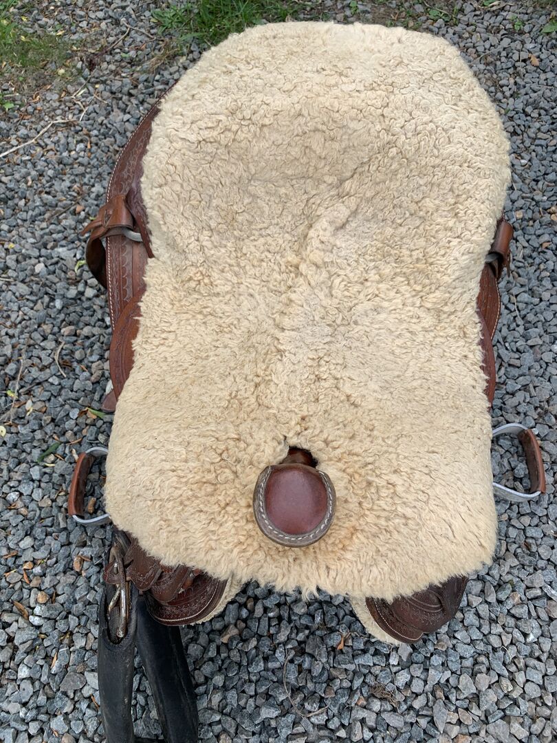 Siodło westernowe - Siodło western średnie do szerokiego. Najwyższy stan. Z drugiej ręki. W komplecie z pasem, strzemionami i siedziskiem ze skóry jagnięcej.