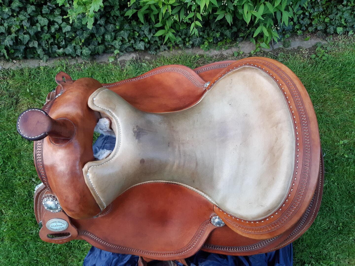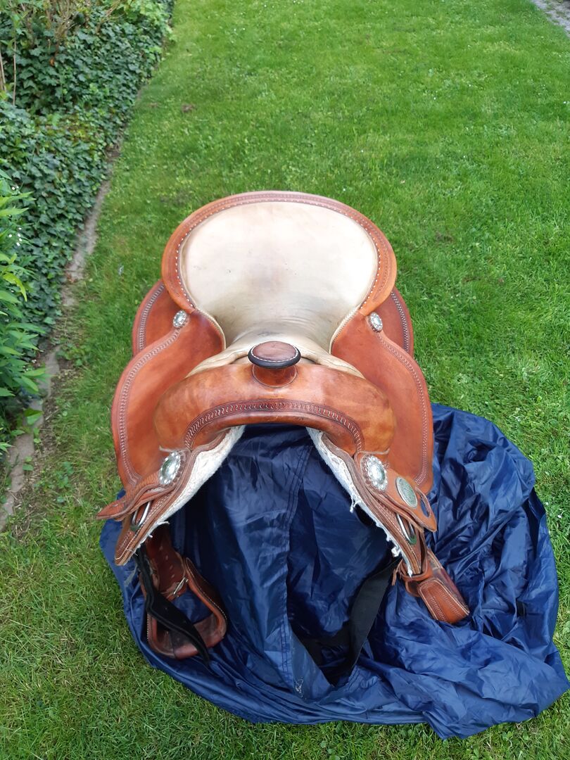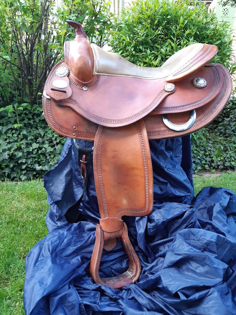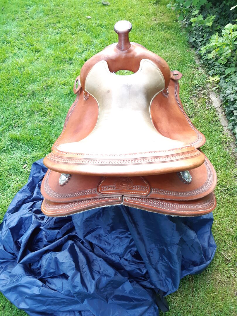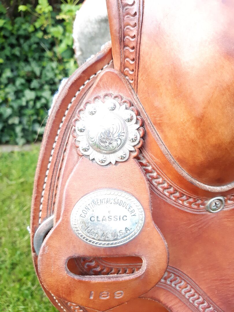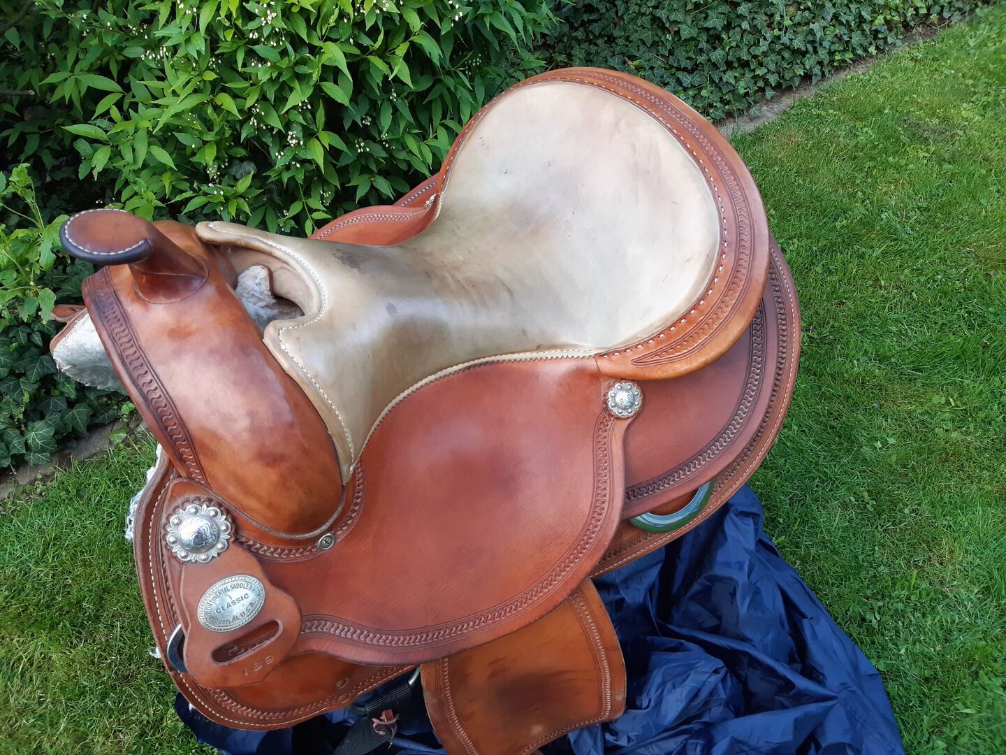 Siodło westernowe - Piękne jasnobrązowe siodło western z jasnym siedziskiem. Siodło jest ozdobione znakami rozpoznawczymi i okuciami. Sprzedawany jest z obwodem. Siodło będzie prawdopodobnie pasować na silniejszą krewniaczkę lub wąską zimnokrwistą. Siodło zostało zakupione jako używane w 2018 r.
