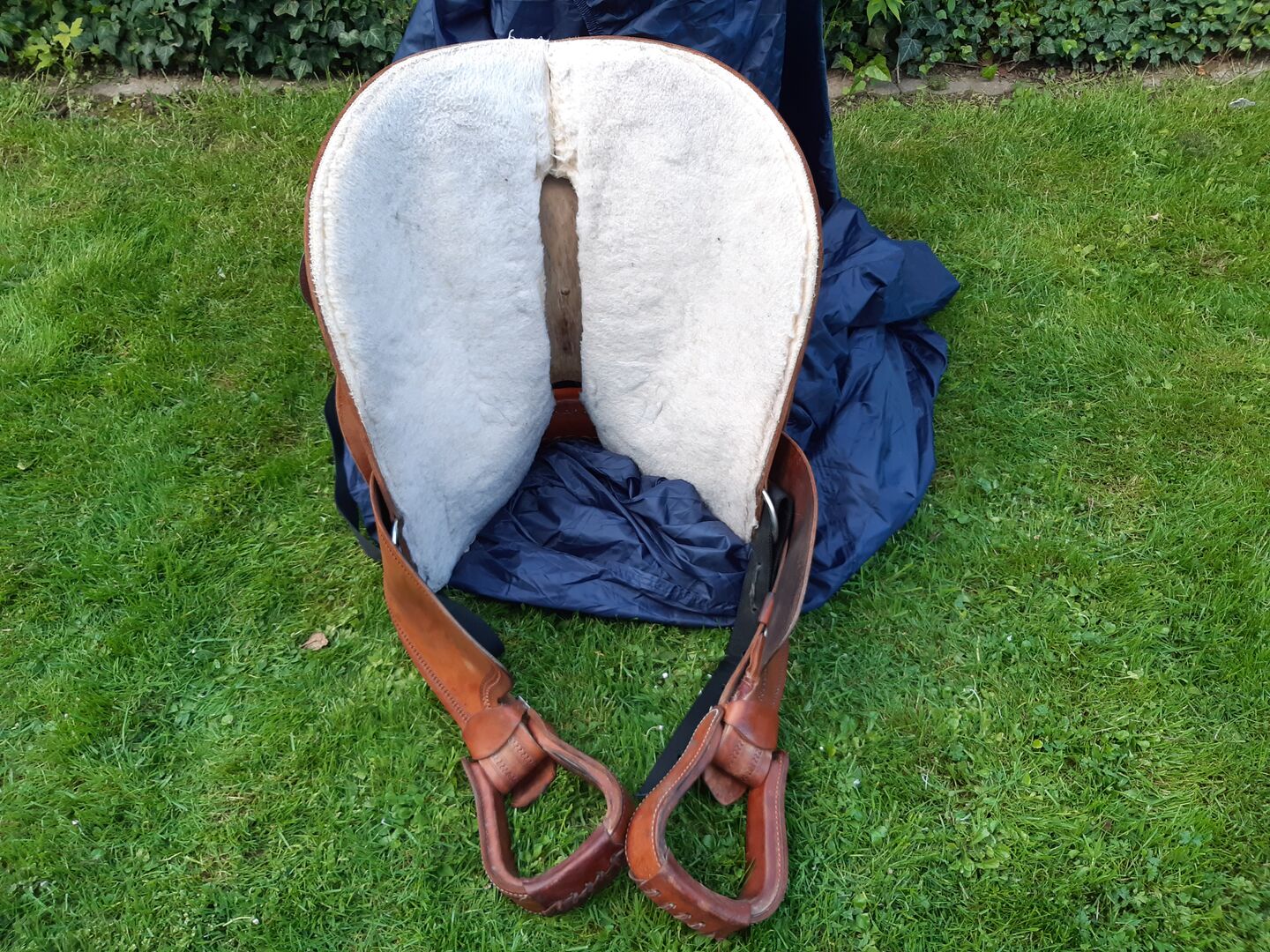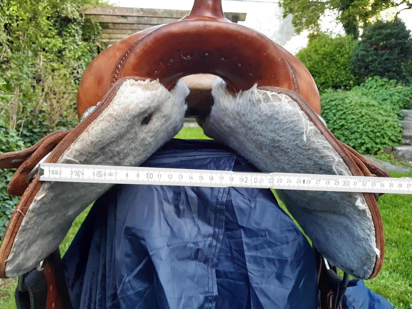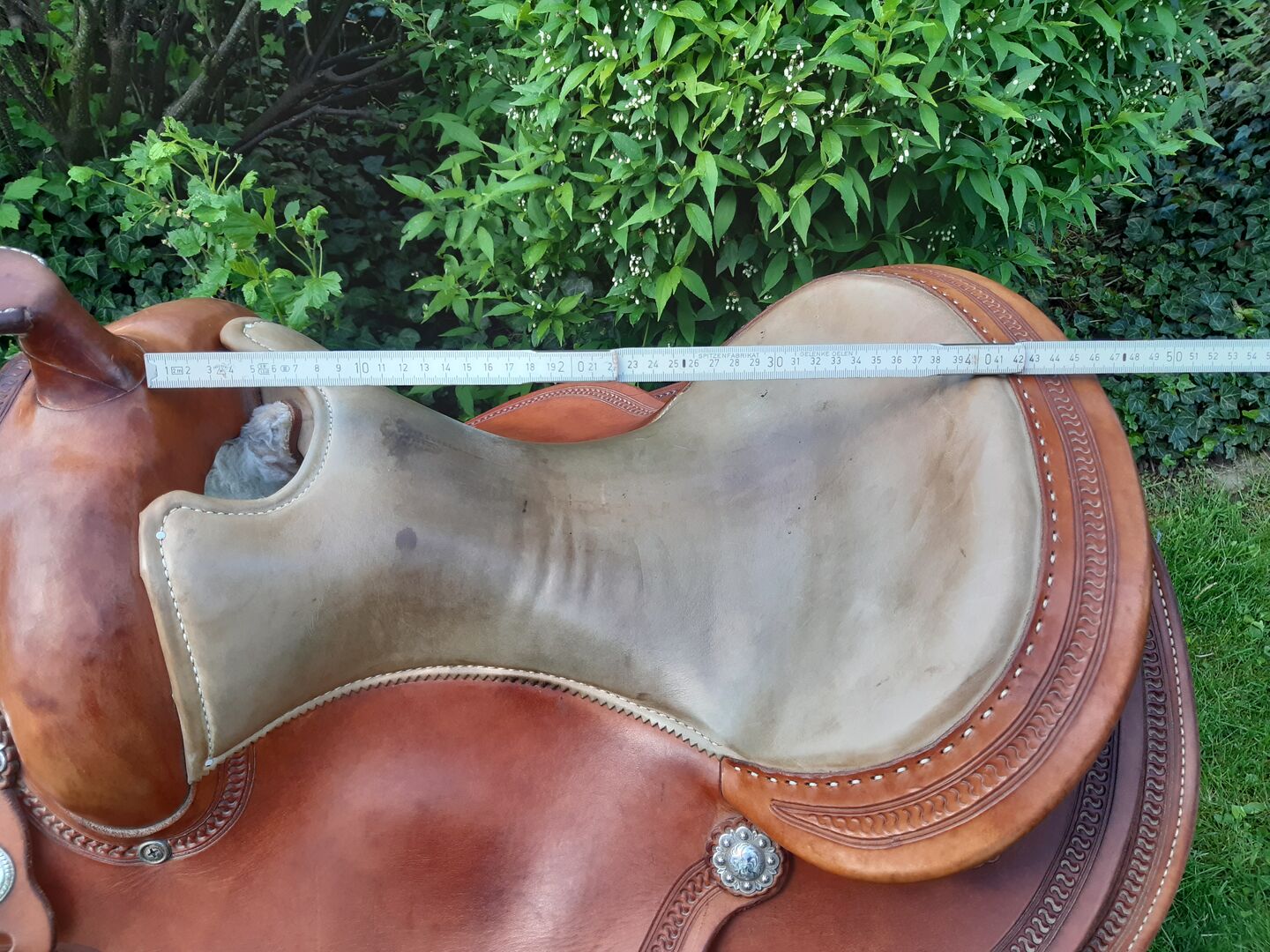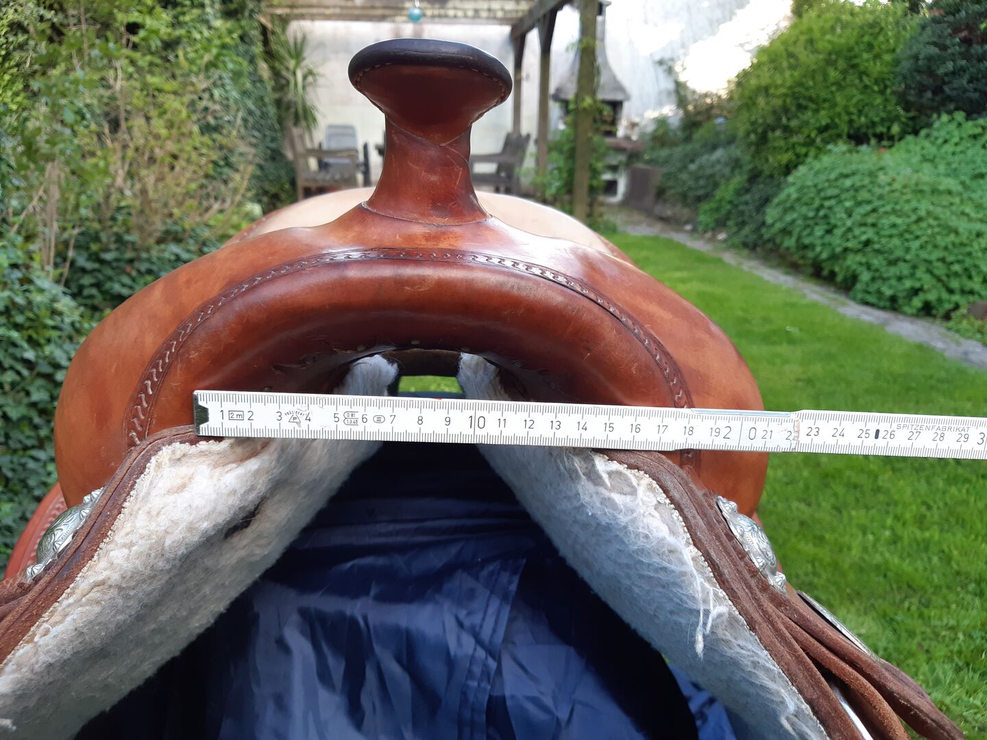 Siodło westernowe - Piękne jasnobrązowe siodło western z jasnym siedziskiem. Siodło jest ozdobione znakami rozpoznawczymi i okuciami. Sprzedawany jest z obwodem. Siodło będzie prawdopodobnie pasować na silniejszą krewniaczkę lub wąską zimnokrwistą. Siodło zostało zakupione jako używane w 2018 r.