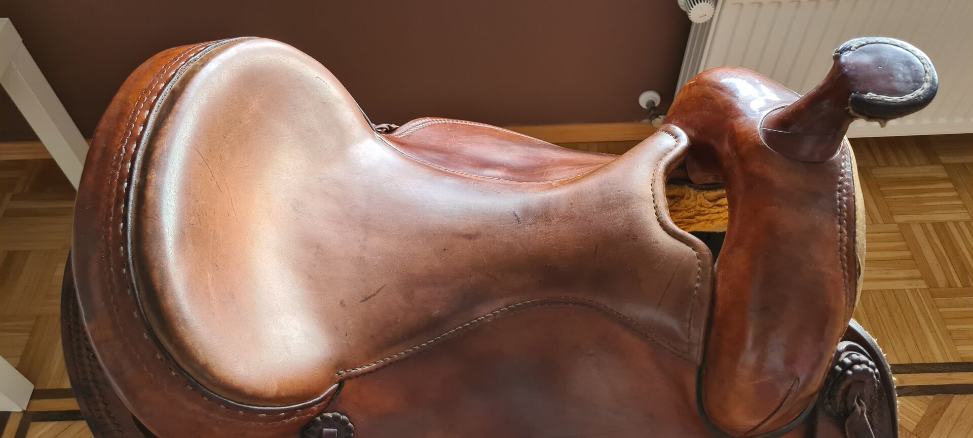 Siodło westernowe - Sprzedaję moje westernowe siodło z Kenner-Store w Hallstadt Bavaria. Sam kupiłem je z drugiej ręki. Niestety nie pasuje już na mojego kuca, wyrósł z niego. Siodło jest w dobrym, używanym stanie. Widać to również na zdjęciach. Pokrowiec i popręg dodaję gratis. Kupujący płaci za wysyłkę, nie ma możliwości zwrotu ani gwarancji.
