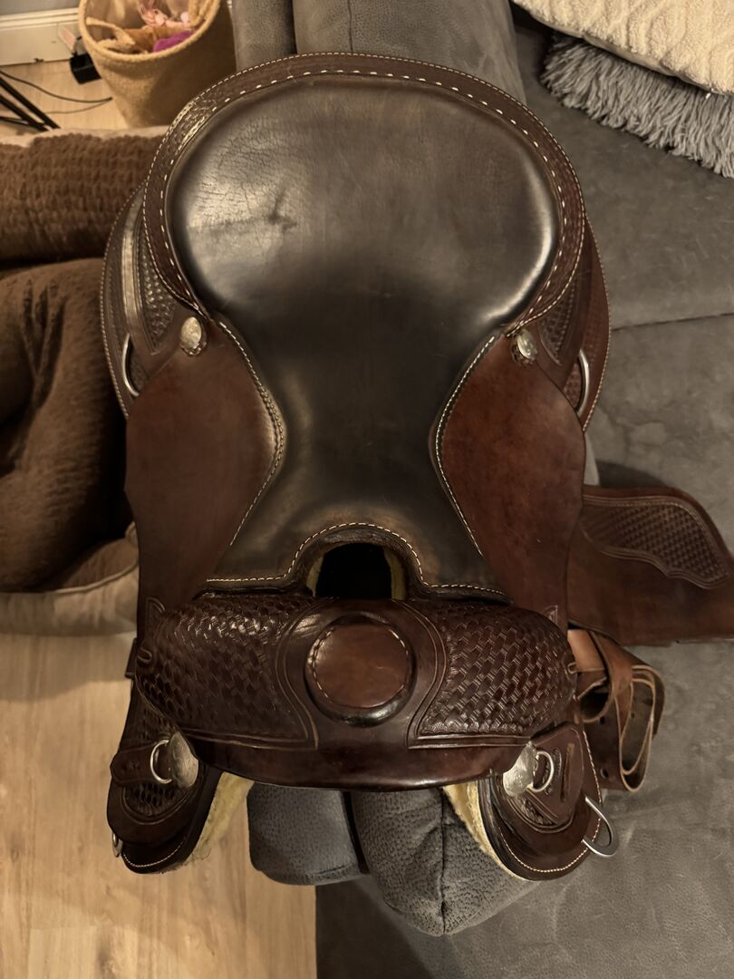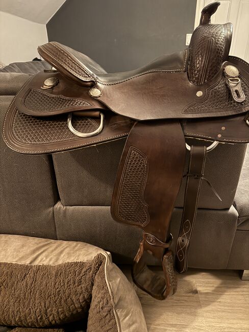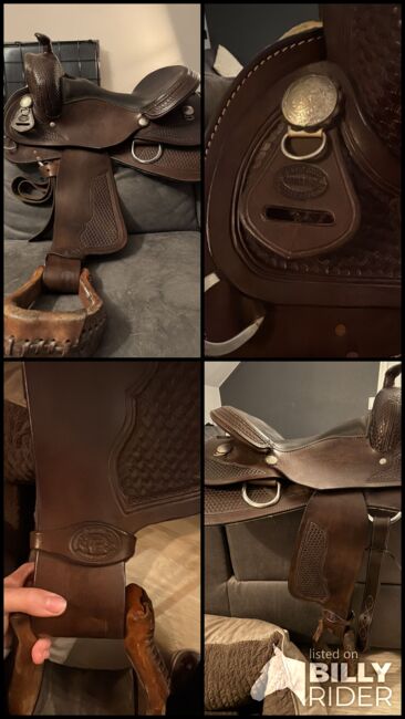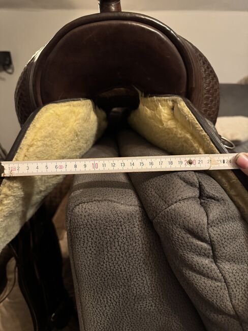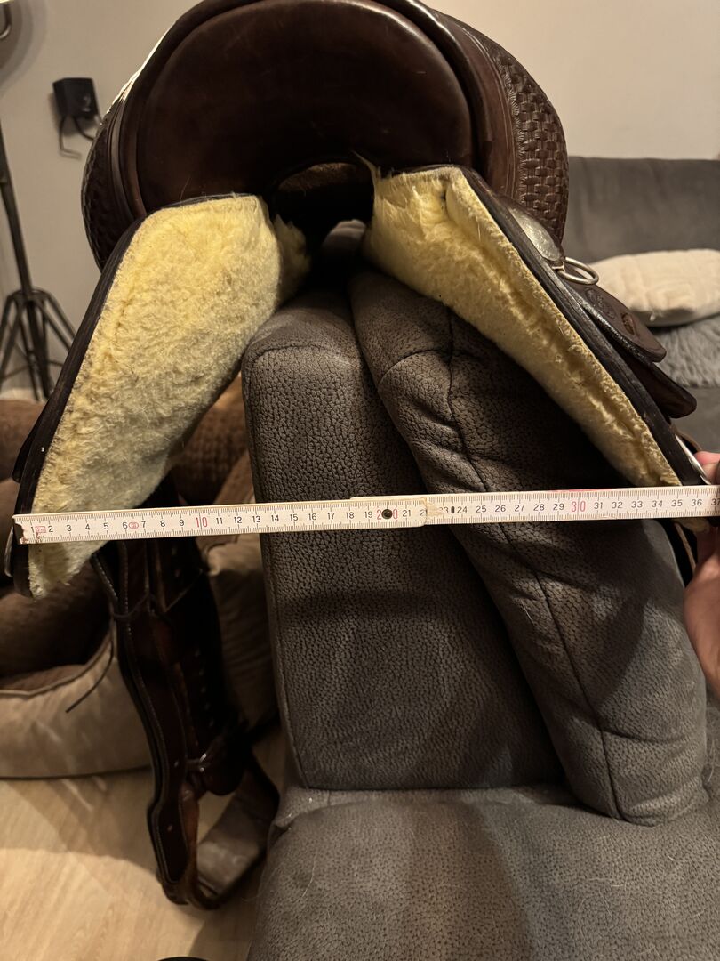 Siodło westernowe - Sprzedaję tutaj moje westernowe siodło. Jest w bardzo dobrym stanie. Nie ma prawie żadnych śladów użytkowania, a skóra jest nadal tak puszysta jak pierwszego dnia. Mam nadzieję, że wymiary można zobaczyć na zdjęciach. Szerokość z tyłu wynosi 55 cm. Pasuje na dość szeroką klacz z kłębiem, patrz ostatnie zdjęcie. Jeśli stajnia jest w okolicy, byłbym również skłonny przyjść, aby go wypróbować. Niechętnie ją wysyłam ze względu na rozmiar i wagę.