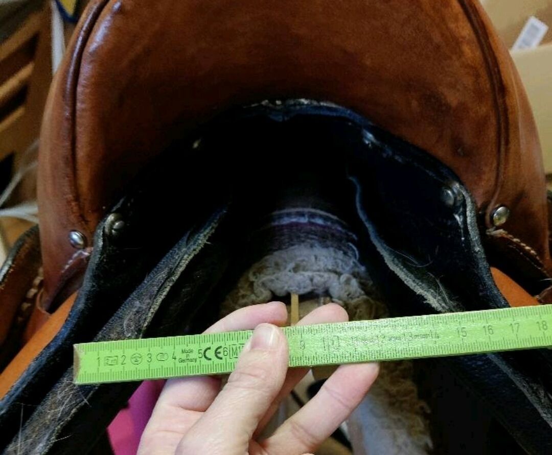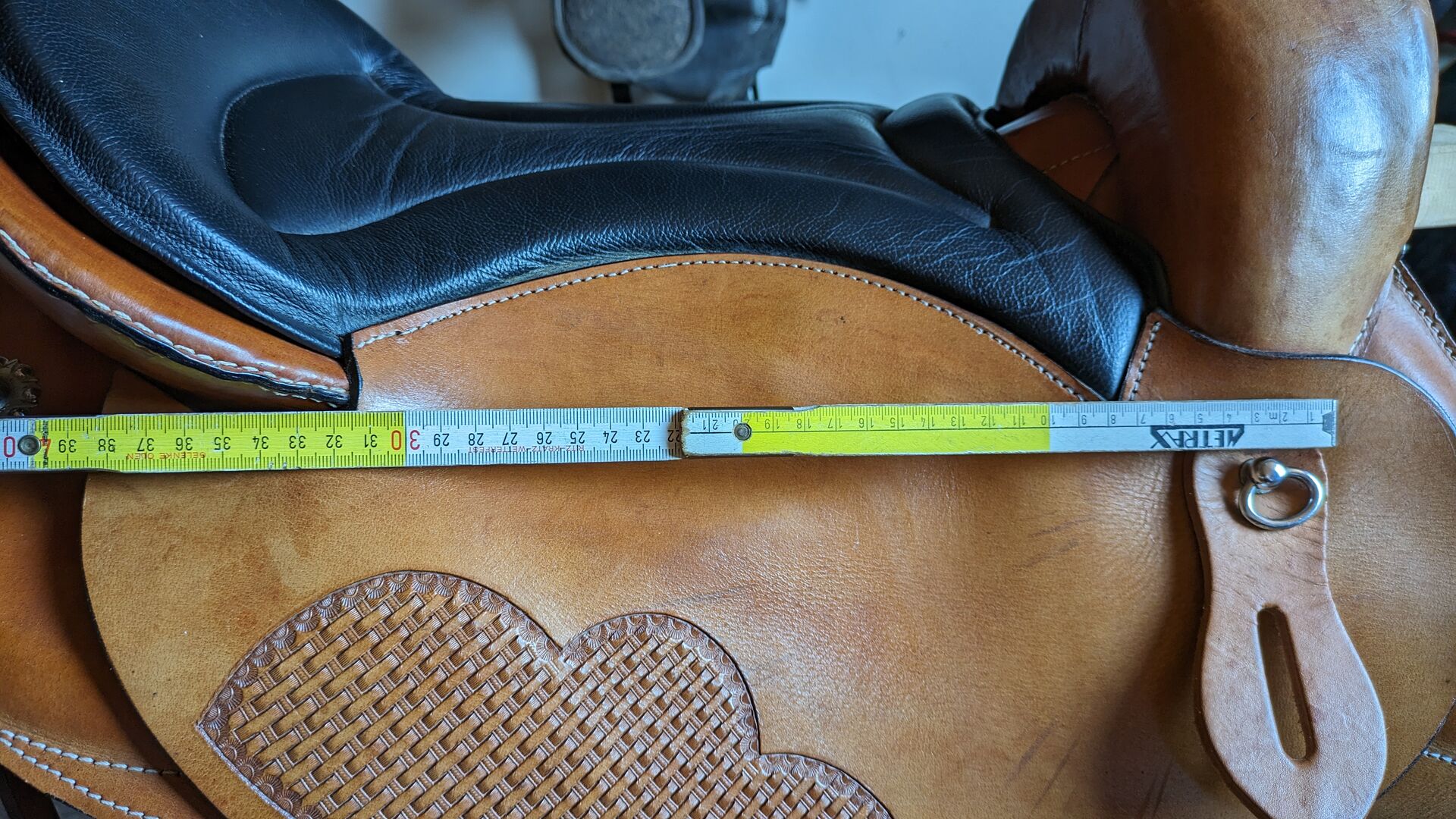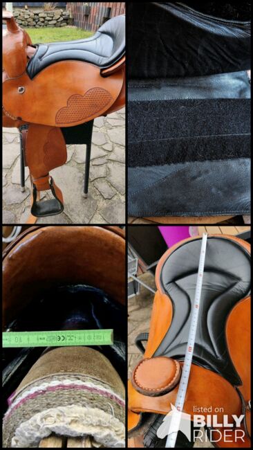 Siodło westernowe - bezdrzewne - W ofercie rzadko używane bezdrzewne siodło westernowe. Można je porównać do Startrek Deuber. Siodło posiada panele na rzepy, za pomocą których można regulować siodło. Jest bardzo stabilne, siedzi się blisko konia, nie ma uczucia gąbki, bardziej jak przy drzewie. Widełki są wymienne i można je stosować również dla koni z lekkim wahaniem. Ja używałam tego siodła na kłusaku. Nadaje się również na krótkie grzbiety, długość ok. 60 cm, siedzisko ok. 42 cm. Dalsze wymiary można zobaczyć na zdjęciach.
