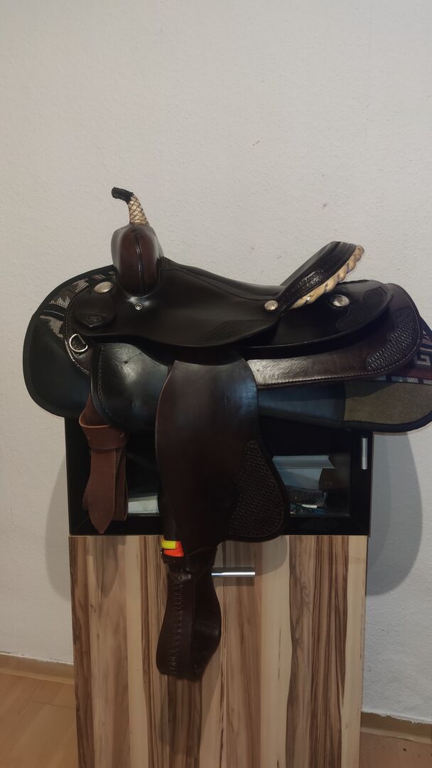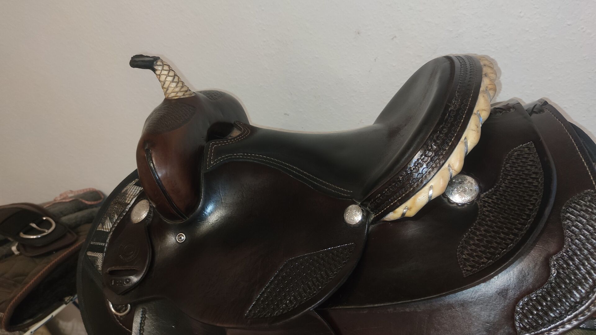 Zakres dostawy - Western siodło kompletne - Busse Western Saddle Girth VINYL-GEL anatomicznie ukształtowany nowy Cena 42,90€ - WESTERN TEETH + BIT HEADSTOCK Uzda westernowa pokazowa *Sheldon* nowa cena 64,95€ - Mattes Rio Pecos Square Westernpad velvet brown padding rozmiar L nowa cena 462€