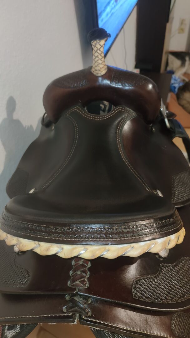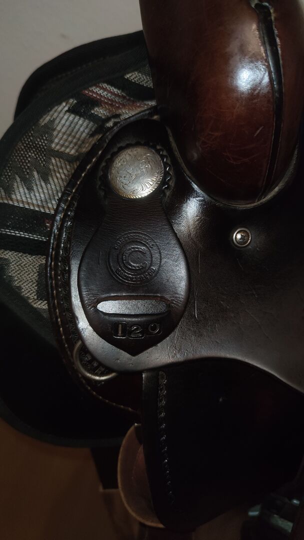 Producent: Continental numer: 120 rozmiar: 15,5-16 cali siedzisko: 37cm Kształt: Okrągła spódnica Powierzchnia podparcia: 65cm Szerokość gullera: ok. 13 cm Odległość choncho: ok. 17-18 cm Dół: ok. 36 cm Dopasowanie: Nadaje się do małych huśtawek dla koni wąskich i średnich ras o dobrej swobodzie ramion. Krój: Semi Quarter Stan: używane, bardzo dobre ślady użytkowania, szczególnie na błotniku, co nie jest niczym niezwykłym dla takiego koloru, nic wadliwego ani otwartych szwów. Siodło jest wyczyszczone i ładnie nasmarowane. Nowa cena wynosiła około 2000€.