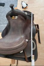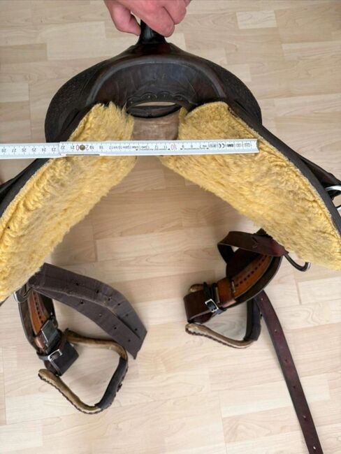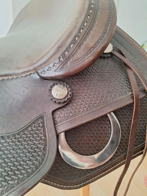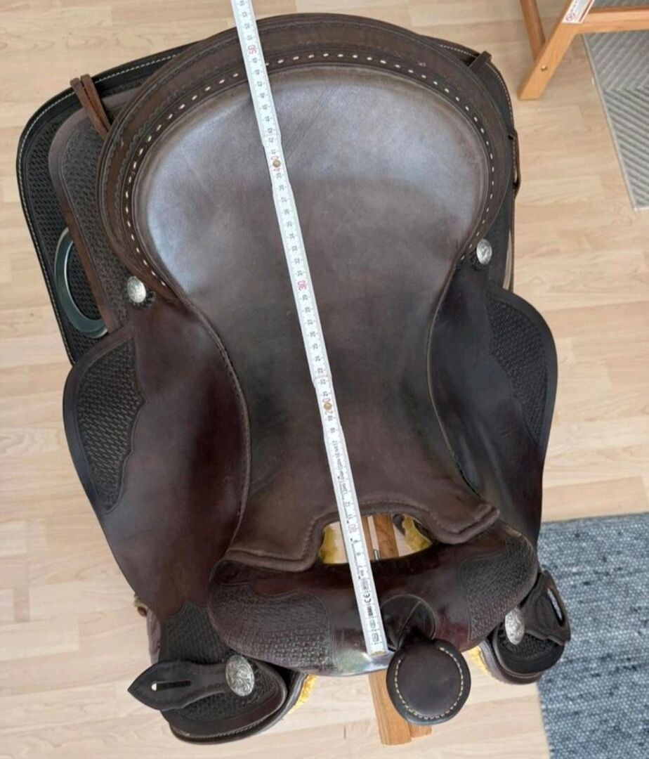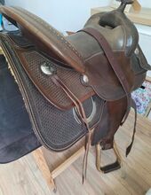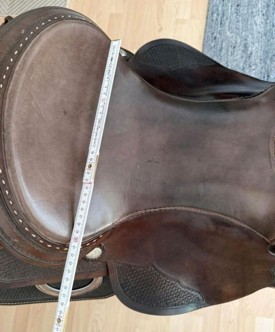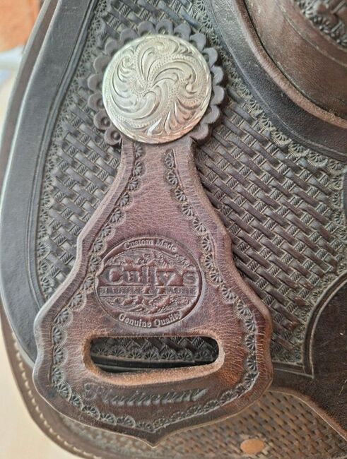 Siodło westernowe Cully's Saddle & More Triple W Platinum + podkładka pod siodło gratis - Z ciężkim sercem sprzedaję moje westernowe siodło z Cully's Saddle & More, Triple W Platinum (drzewo 305 lub 303 - 8660 - 02) w kolorze ciemnobrązowym i w dobrym stanie. Było na Tinkerze z wysokim kłębie. Ze strzemionami. Oferuję również spersonalizowany i starannie wykonany pokrowiec na siodło softshell (idealny na przykład do jazdy w deszczu). Dopasowanie siodła w okolicy jest możliwe za opłatą (która nie jest wliczona w cenę zakupu).