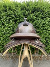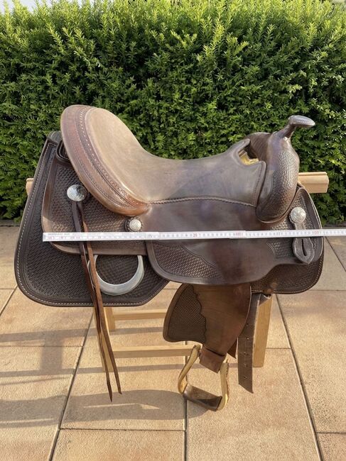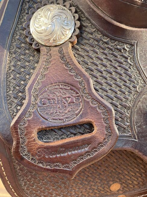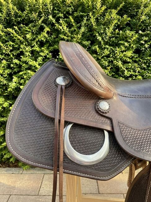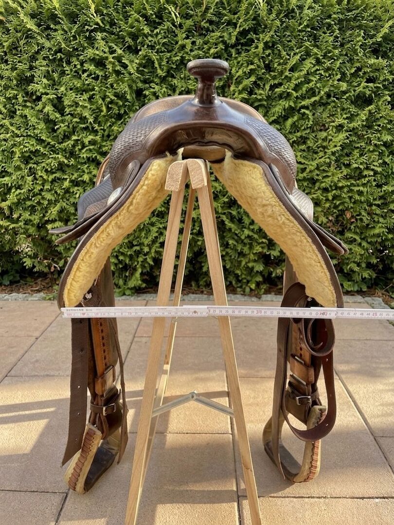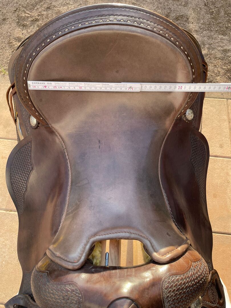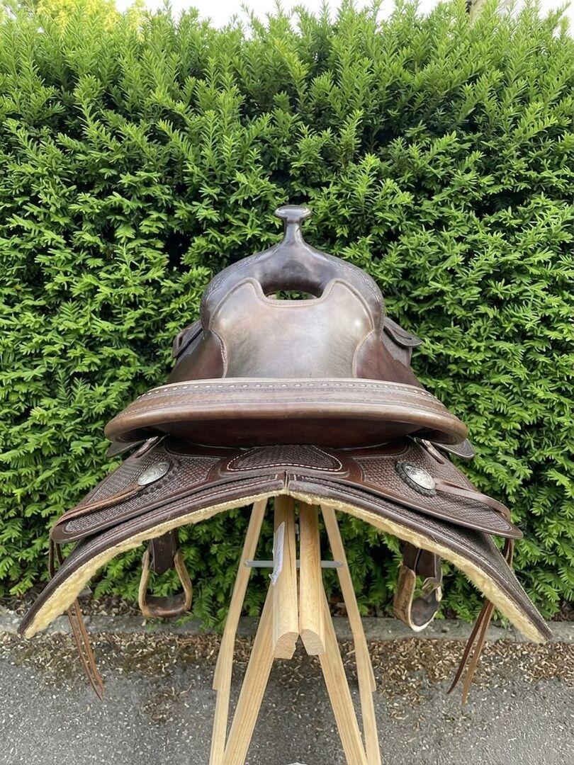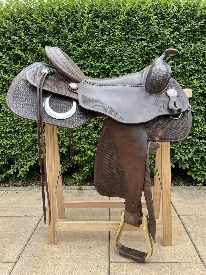 Siodło westernowe Cully's Saddle & More Triple W Platinum + podkładka pod siodło gratis - Z ciężkim sercem sprzedaję moje westernowe siodło z Cully's Saddle & More, Triple W Platinum (drzewo 305 lub 303 - 8660 - 02) w kolorze ciemnobrązowym i w dobrym stanie. Było na Tinkerze z wysokim kłębie. Ze strzemionami. Rozmiar siedziska 16 cali. Oferuję również spersonalizowany i pięknie wykonany pokrowiec na siodło softshell (idealny na przykład do jazdy w deszczu). Dopasowanie siodła w okolicy jest możliwe za opłatą (która nie jest wliczona w cenę zakupu).