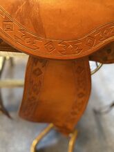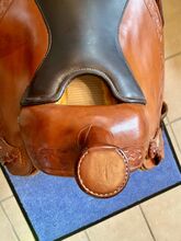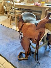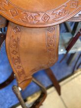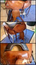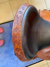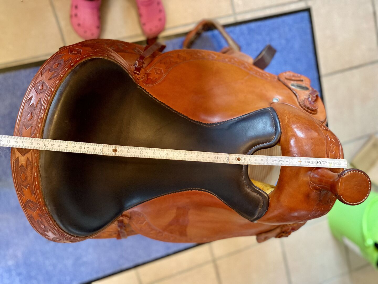 Siodło westernowe Deuber and Partner RARITY - Oferuję tutaj dobrze utrzymanego Trail Ridera. Siodła z tym wzorem to rzadkość, szczególnie w takim stanie. Siodło jest sprawdzonym klasykiem i łączy w sobie wygodę, lekkość i funkcjonalność. Jego lekka konstrukcja, praktyczna okrągła spódnica, która jest szczególnie korzystna dla KRÓTKICH koni, oraz wysoki poziom komfortu sprawiają, że to westernowe siodło jest naprawdę wszechstronne. Drewniany łęk Rozmiar siedziska 16 Skóra siodła naturalna Skóra siedziska czarna Błotnik S Skórzany róg Skóra surowa na strzemiona Waga 12 KG Długość spódnicy ok. 62 cm, Głębokość spódnicy ok. 31 cm PS lekkie zarysowanie na prawym boku, widoczne na zdjęciu jako nieco ciemniejsza plama, ponieważ nałożyłem na nią wosk. Niestety stało się to podczas dzisiejszego transportu. Nie jest głęboka, na życzenie zrobię zdjęcia.