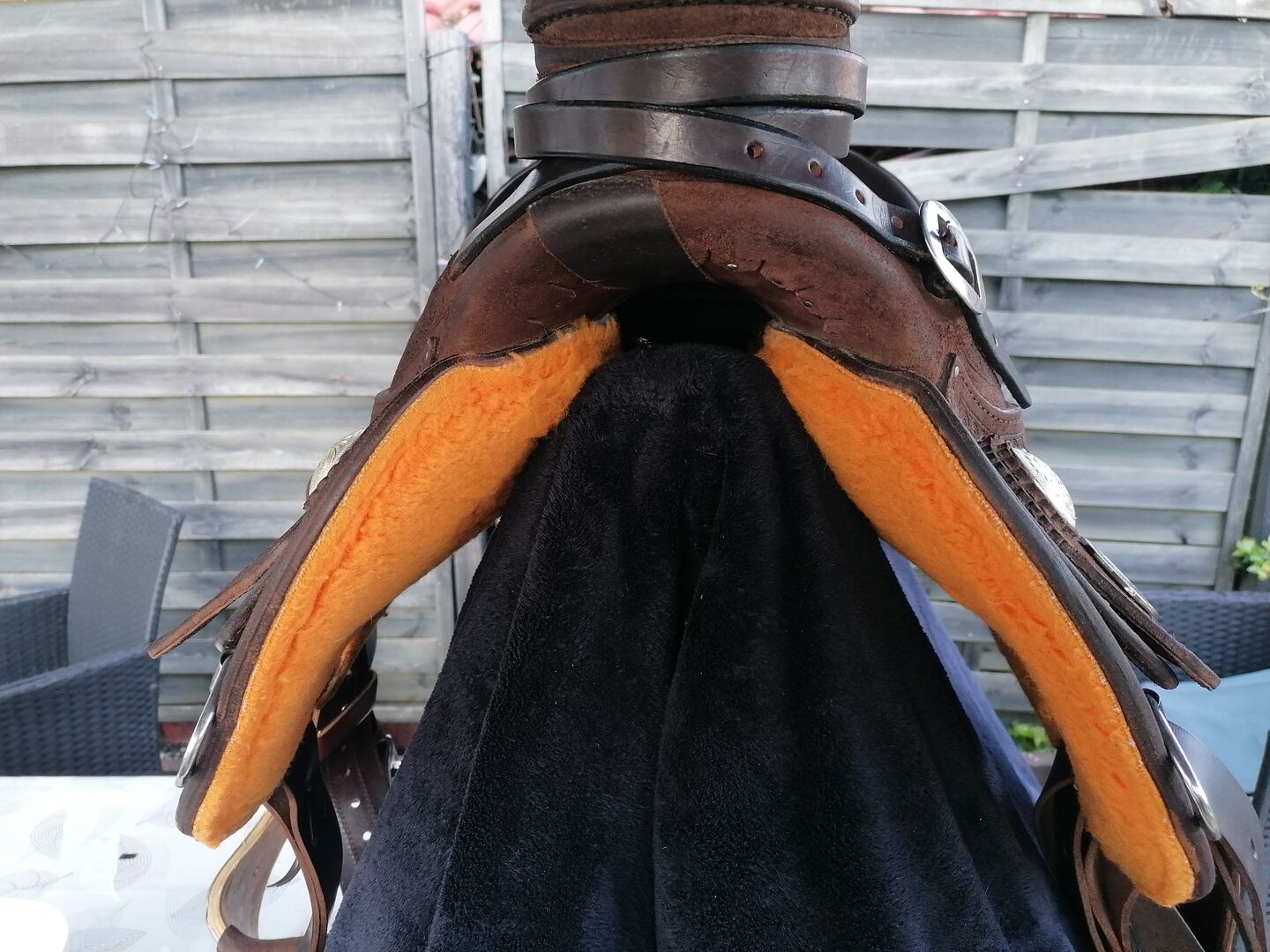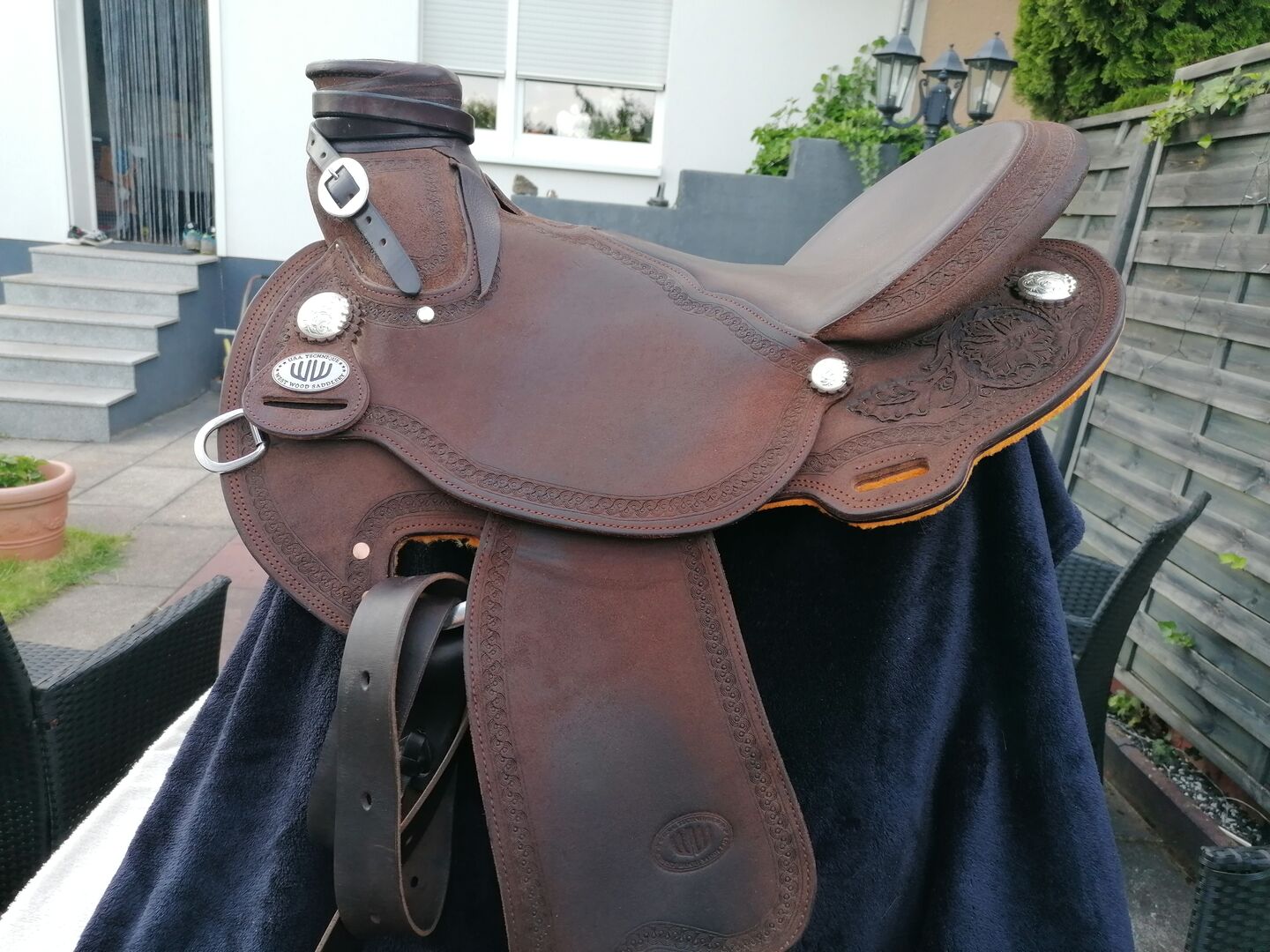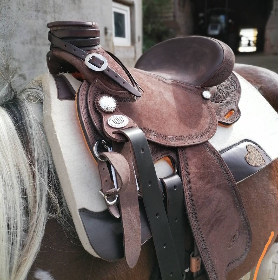 Siodło westernowe FQH Lady Wade krótkie i lekkie - Z ciężkim sercem sprzedaję moje Ladies Wade z ciemnobrązowej skóry zamszowej/nubukowej, ponieważ nie pasuje już idealnie na moją klacz. Zapewnia wymaganą swobodę ramion konia, wrażliwa pozycja siodła jest wspierana przez otwarty obszar zacisku grzbietu, a optymalna krótkość siodła zapobiega podrażnieniom w okolicy stawu SI. Waży około 11 kg. Siedzisko 16er Odwrócony błotnik, Piękne wytłoczenia w kwiaty Piękne srebrne konchy BEZ strzemion