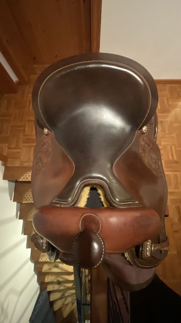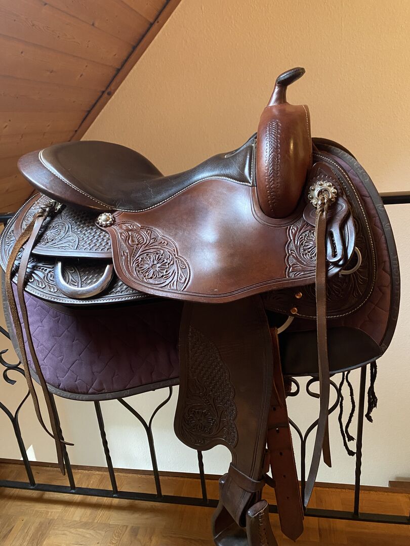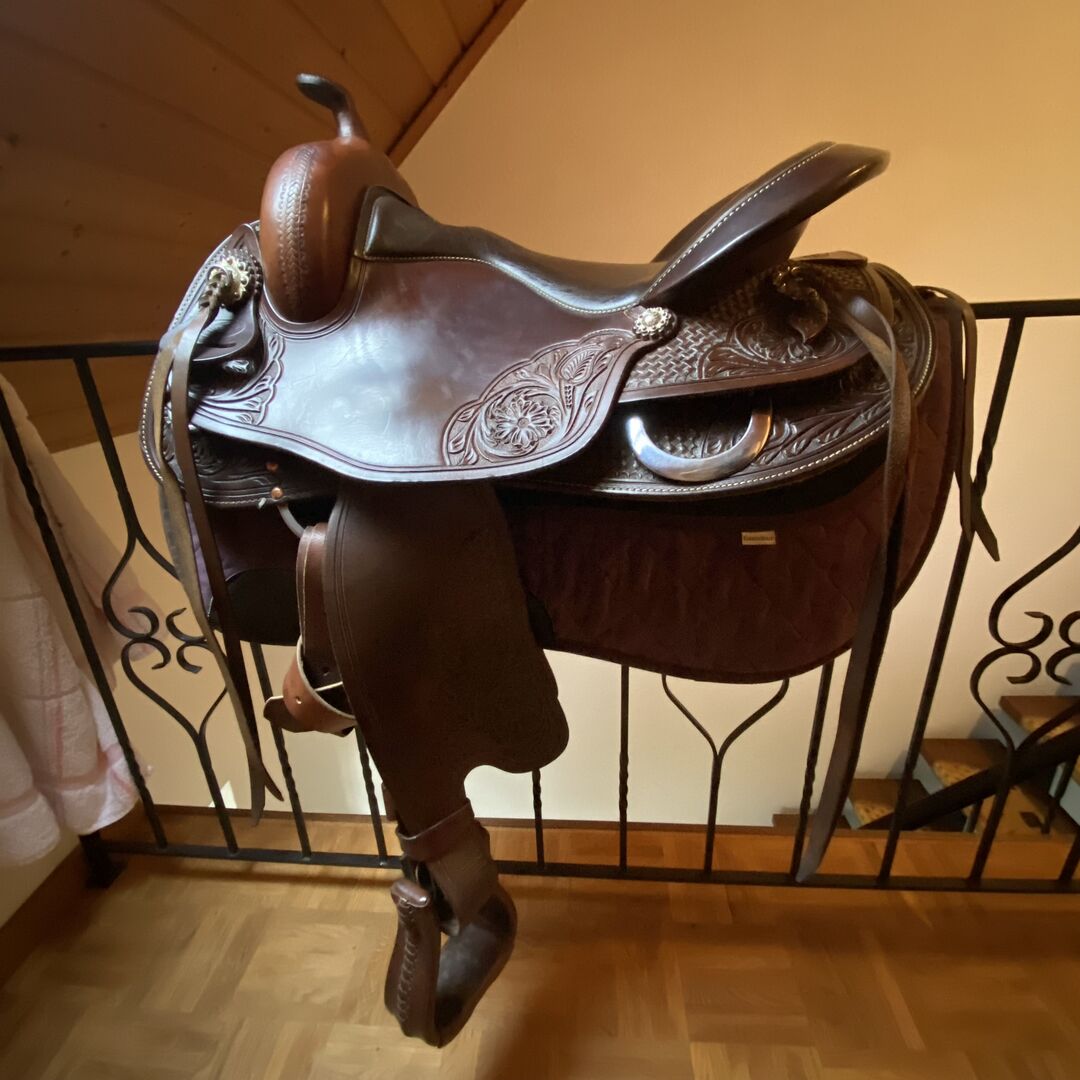 Siodło westernowe Freemax Round cow - Sprzedam moje westernowe siodło Freemax Model Round długość siodła 65 cm skóra bydlęca kolor choko rozmiar siedziska 16" obecnie zainstalowany jest widelec 5 który można zmienić na widelec 4 przy niewielkim wysiłku, wkładając kliny Rok budowy 2016, data zakupu maj 2017 Dobrze utrzymany i zawsze przechowywany w sposób zgodny z Freemax. Siodełko 650,- € z kosztami wysyłki Siodełko używane do tego Grandeur Physio Pad (76 cm) z siatką samoprzylepną 1/3 wraz z filcową wyściółką w dużych kieszeniach i gumą piankową do optymalizacji siodełka w małych kieszeniach, można również kupić.