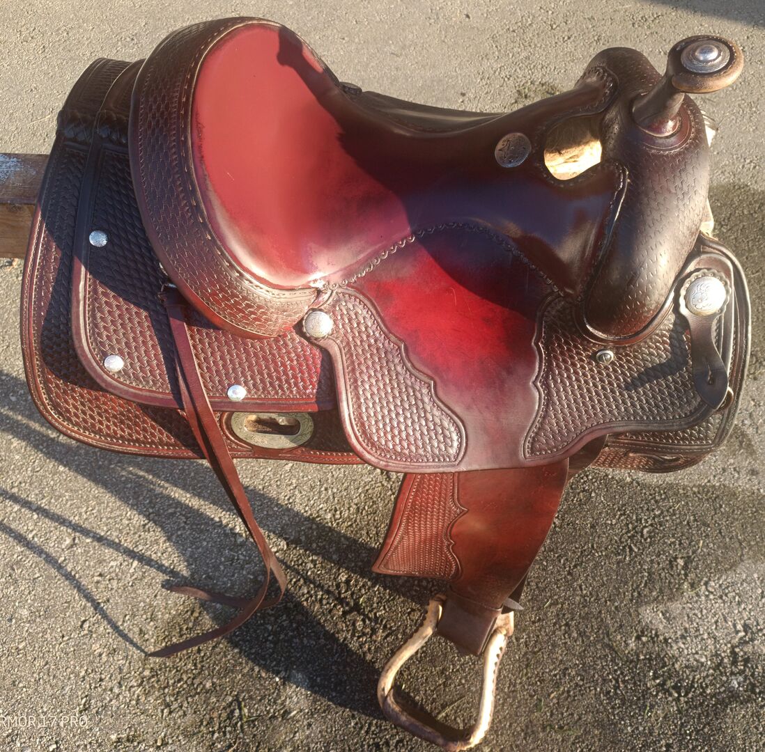Siodło westernowe Longhorn - Mam na sprzedaż westernowe siodło Longhorn. Dopasowane do konia rasy Haflinger. Zobacz zdjęcia wymiarów i stanu. Nie mogę wiele powiedzieć o samym siodle, ponieważ zostało ono dostarczone wraz z koniem, kiedy je kupiłem.