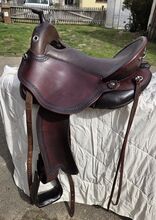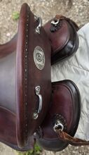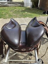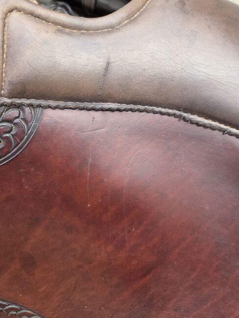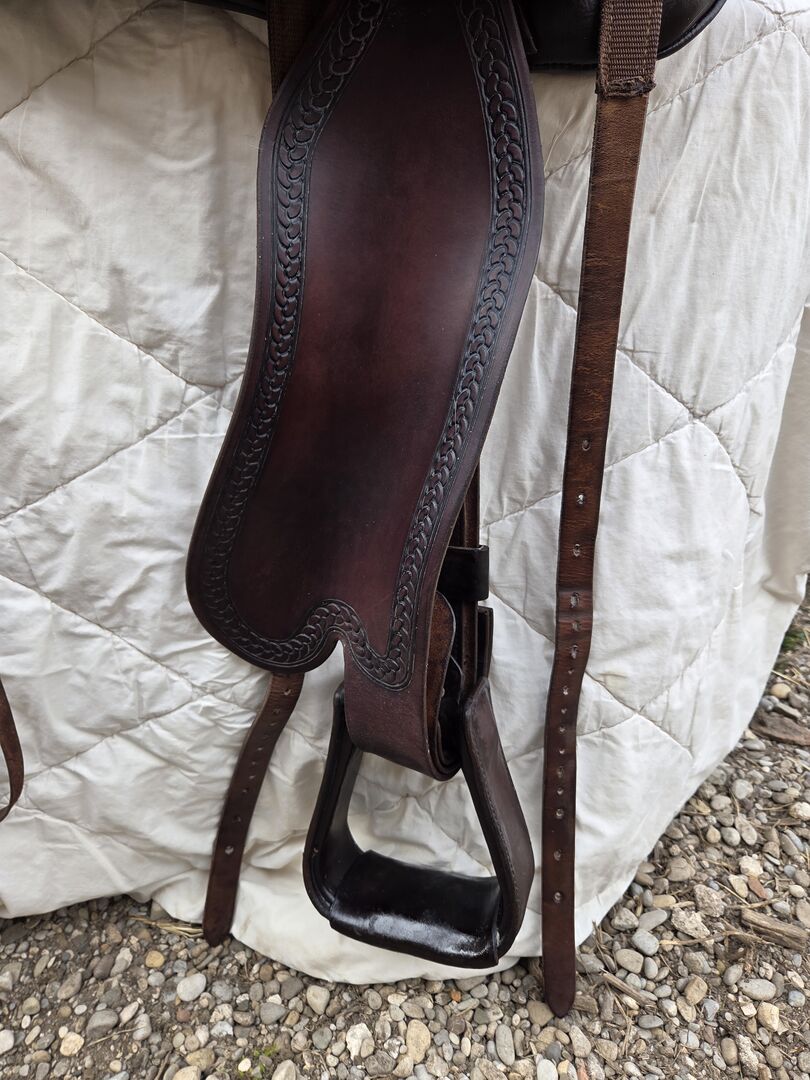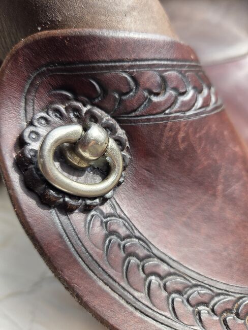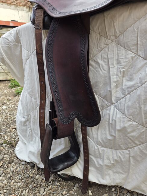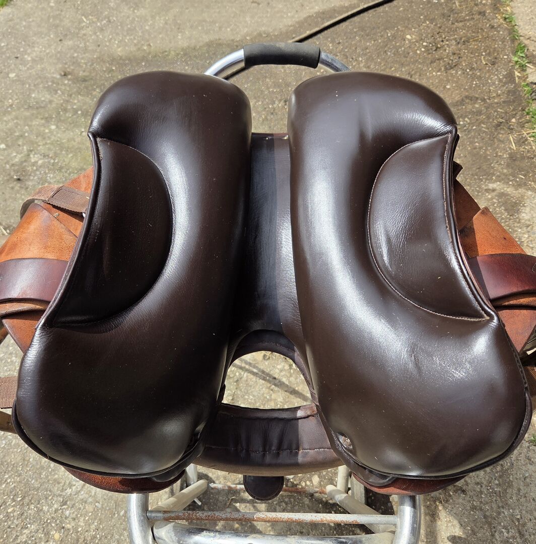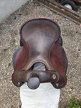 Cechy i szczegóły: Wędzidło: Ultra-Flex (płynna regulacja) Skóra: antyczny brąz Havana (najwyższej jakości skóra siodłowa) Wyściółka: ciemnobrązowa skóra nubukowa Okucia: Chrom Znakowanie: Border Strzemiona: strzemiona z surowej skóry Waga: ok. 8,5 kg (bardzo lekkie!) Wymiary: Długość siodła: ok. 53 cm Długość klapy siodła: ok. 31 cm Długość błotnika: dostępne S/M/L (w zależności od regulacji) Cechy szczególne: krótka, przyjazna dla konia konstrukcja Ochrona ślizgu błotnika 4 pierścienie (chromowane) Akcesoria: brązowy pokrowiec na siodło od Mattes Popręg siodła Dobrze utrzymany stan używany z normalnymi śladami użytkowania (bez uszkodzeń, w pełni sprawny).