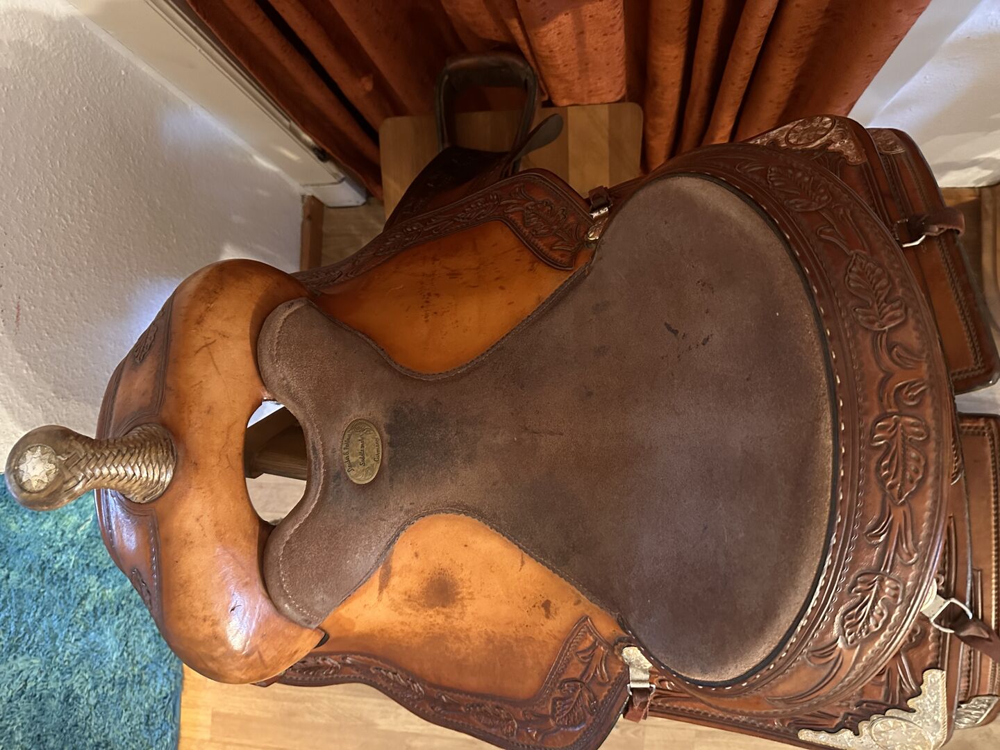 Siodło westernowe, siodło pokazowe Deuber and Partner - Oferuję świetne westernowe siodło od Deuber und Partner. Srebrne okucia sprawiają, że przyciąga wzrok podczas pokazów i występów. Szczegóły można znaleźć na zdjęciach.