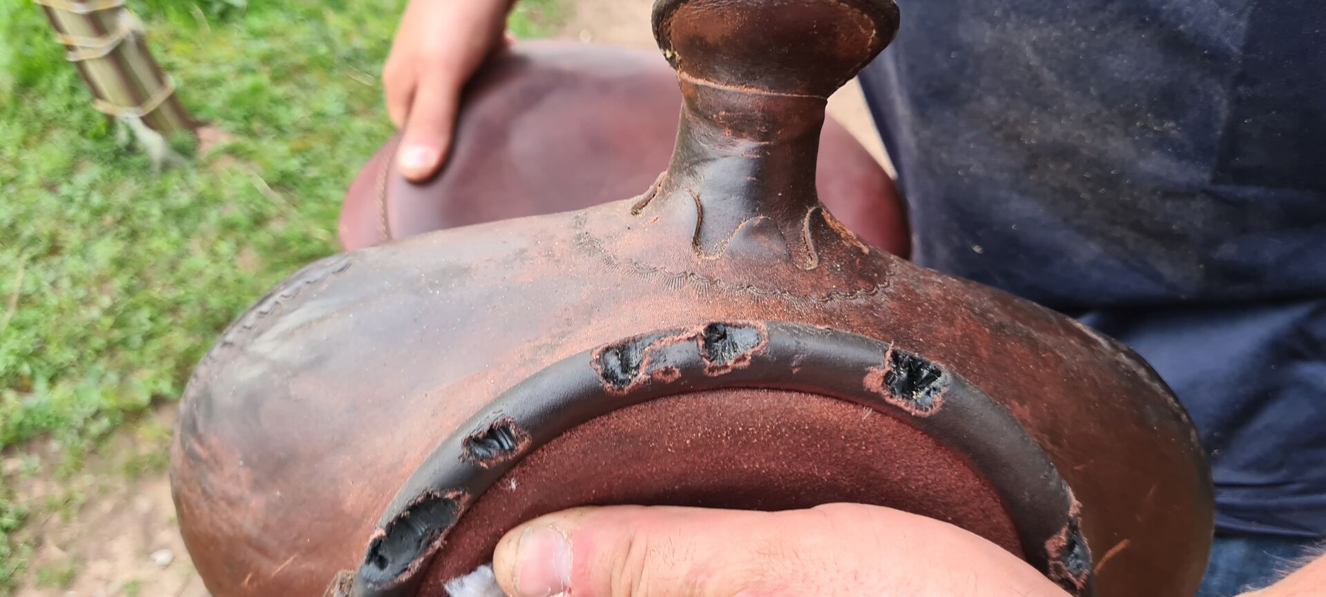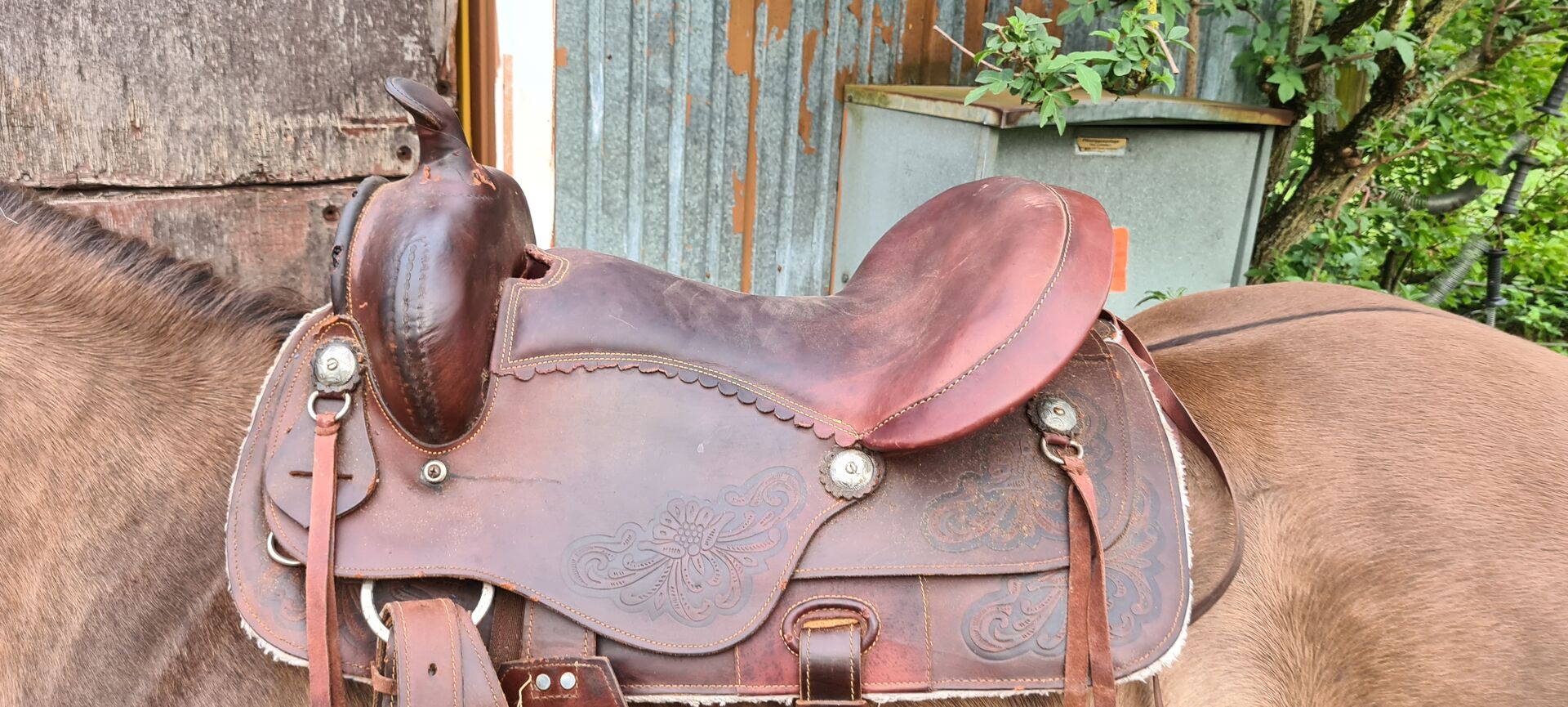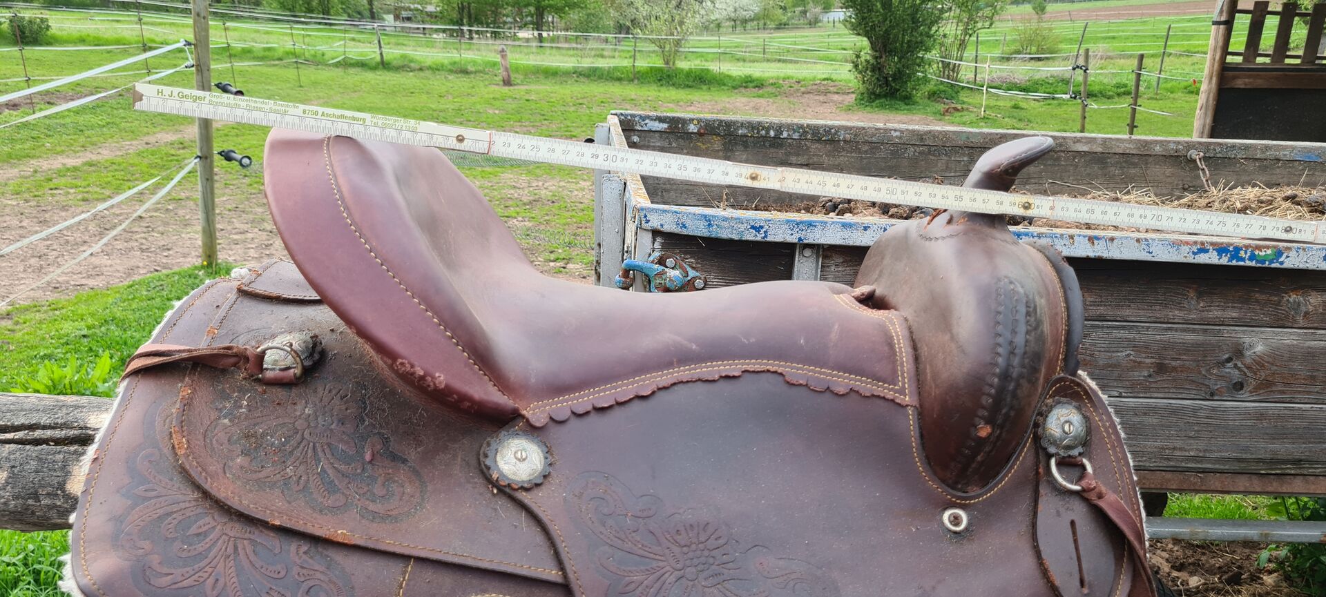 Siodło westernowe z grubą wyściółką - Używane, eleganckie siodło western. Grubo wyściełane... Niestety kiełzno na gumie jest trochę uszkodzone, ale można je zdjąć... Było na koniu 3 razy i od tego czasu przechowywane w suchym miejscu... Wymiary podane są na zdjęciach... Możliwa wysyłka po opłaceniu kosztów z góry... Siedzisko 16 cali