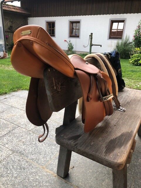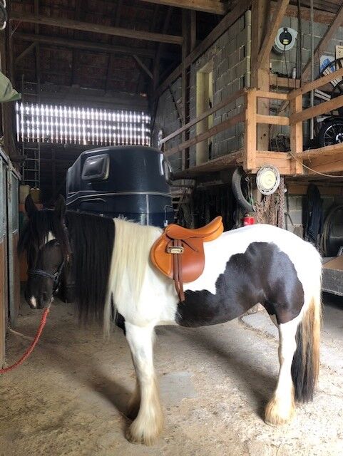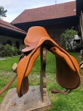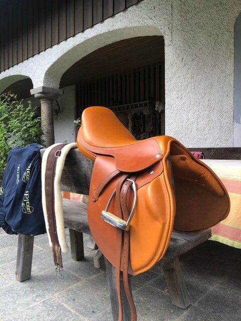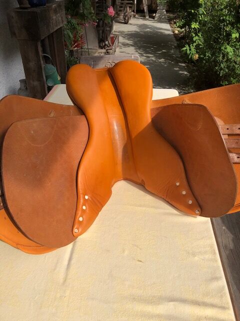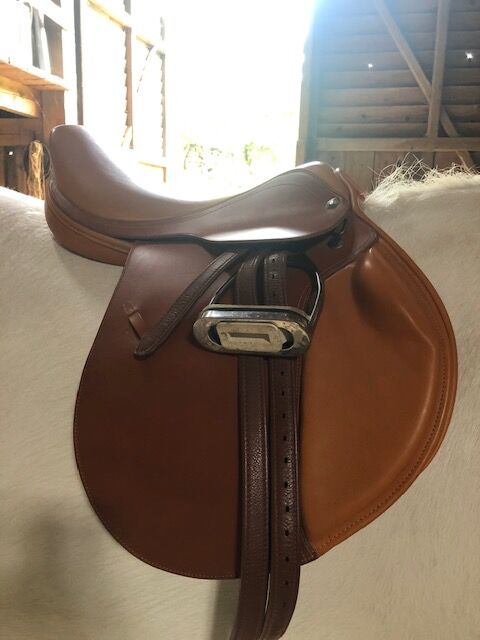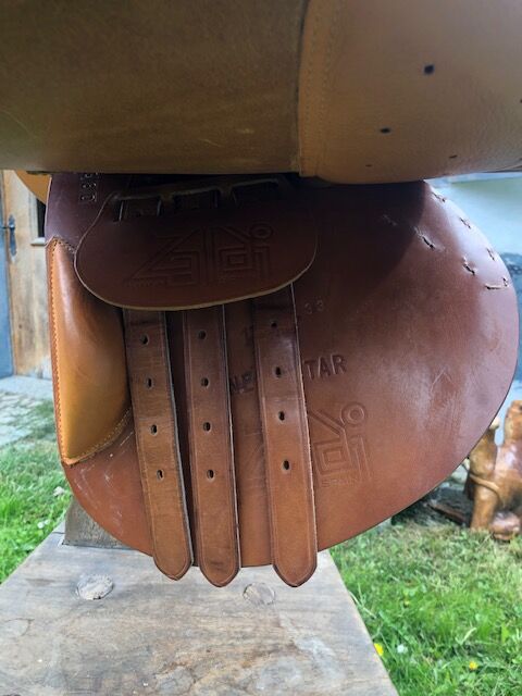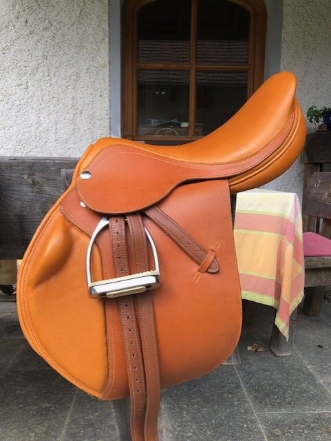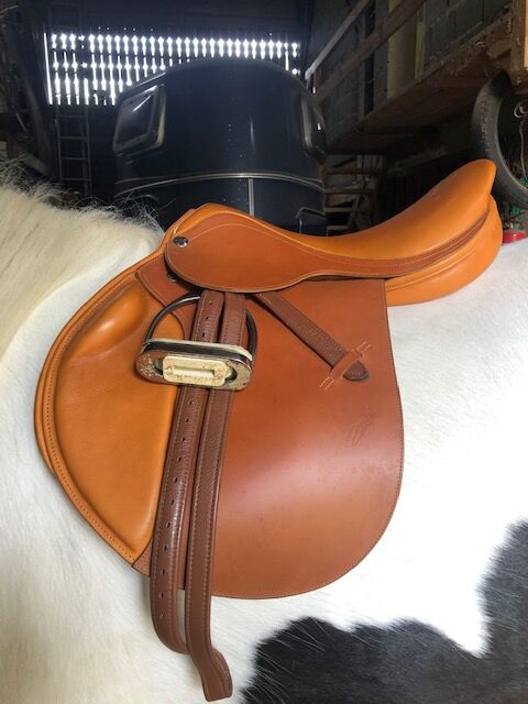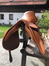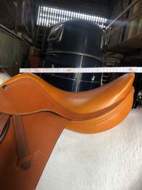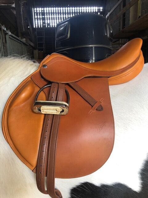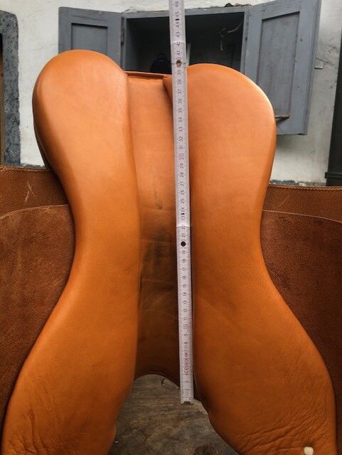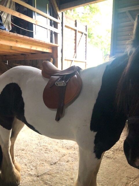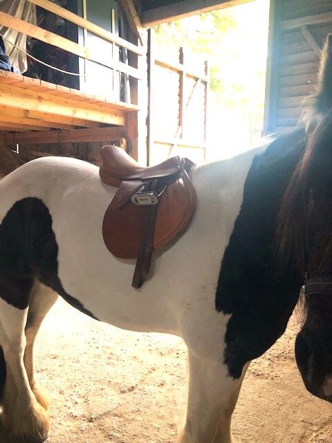 Siodło Zaldi do skoków wykonane na zamówienie - W bardzo dobrym stanie, najwyższej jakości siodło skokowe Zaldi. Szerokość łęku wynosi 33 i jest regulowana. Leży na stopach na barokowej klaczy pinto z normalnym kłębiem. Zapraszamy do obejrzenia, można zabrać ze sobą do wypróbowania za kaucją.