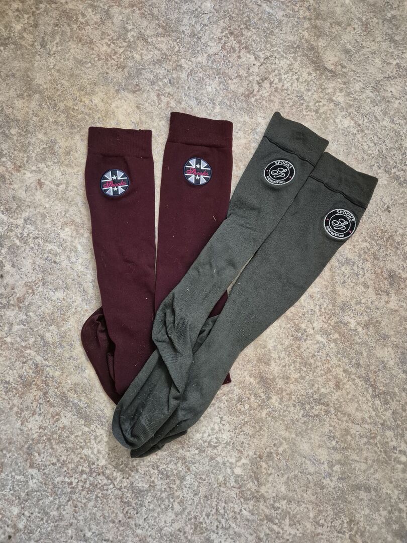 Skarpety jeździeckie Spooks - W ofercie chętnie noszone, ale dobrze zachowane skarpety jeździeckie firmy Spooks. W rozmiarze 38 w kolorze szarym i jeżynowym.