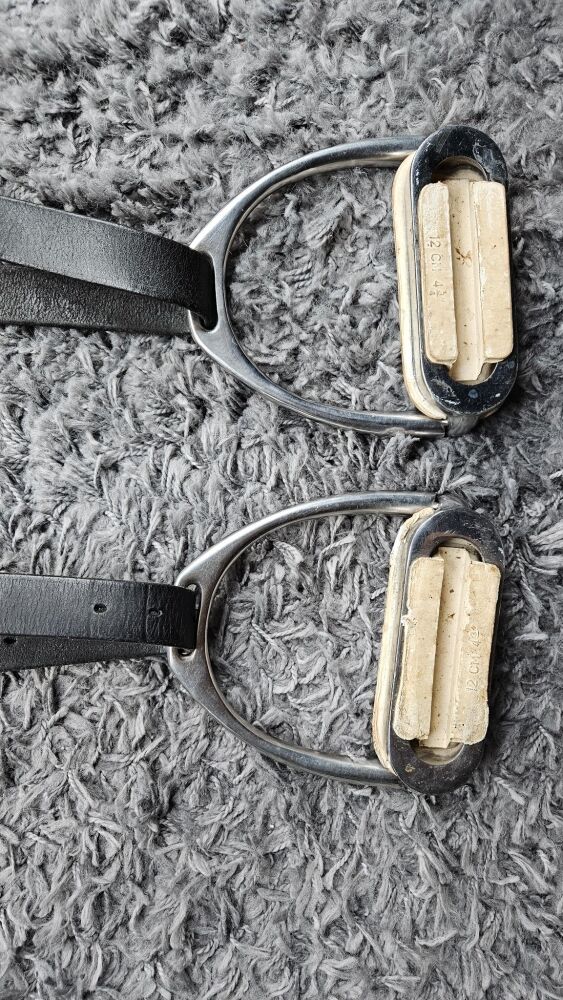 Chciałbym sprzedać używaną parę strzemion ochronnych (składanych) ze skórzanymi paskami.