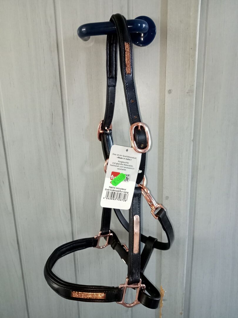 Skórzana halterka - Nowy skórzany halter z różanymi okuciami, błyszczącymi kamieniami i tabliczką z grawerem.