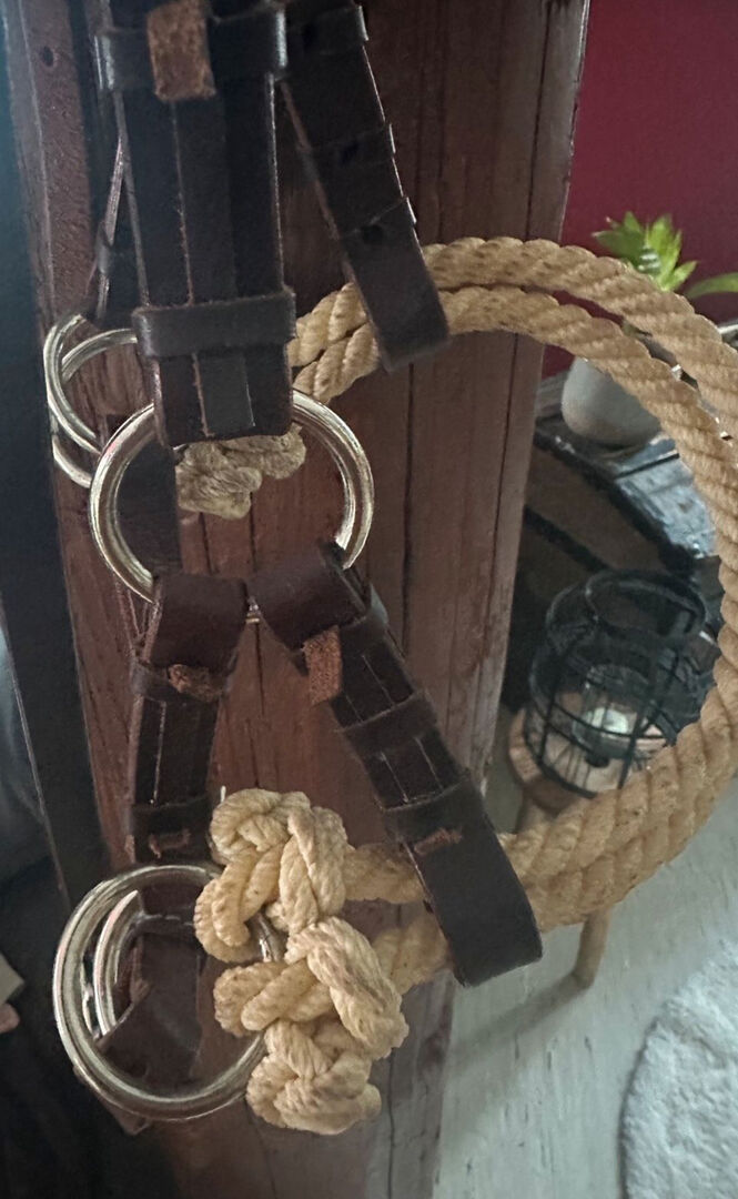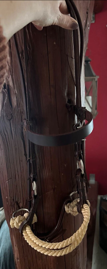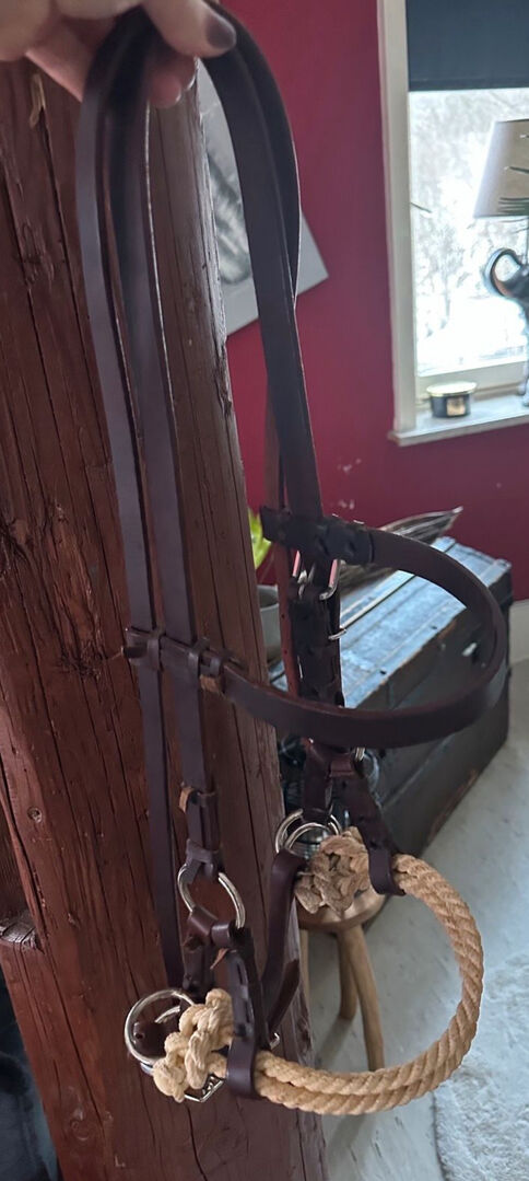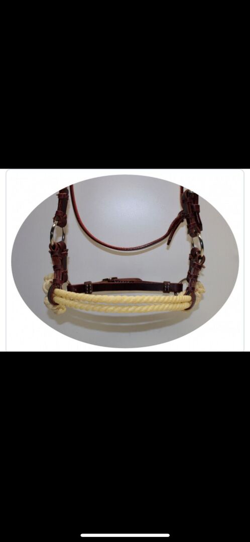 Skórzana uprząż Sidepull z podwójnym noskiem ze skóry Latigo - Najwyższa jakość wykonania z elastycznej skóry Latigo! Z podwójnym nylonowym noskiem. Naczółek wykonany z wysokiej jakości skóry latigo. Rozmiar "QH", odpowiedni dla wszystkich koni rasy Quarter, Paints, Haflinger i koni podobnej wielkości od ok. 2 lat. Duża możliwość regulacji. Z kilkoma stalowymi pierścieniami po bokach, a także paskami podbródkowymi i gardłowymi. Idealny do treningu/korekty młodych koni i do treningu bez wędzidła. Sidepull ma kształt haltera, ale ze wzmocnionym paskiem na nos wykonanym z woskowanej liny lasso, która leży jako luźny pierścień wokół pyska konia. Pierścienie są przymocowane po prawej i lewej stronie paska na nos, do którego zaczepione są lejce. Działa tylko na nosie i ma swoje korzenie w jeździectwie westernowym, gdzie jest używany do łamania młodych koni. Sidepull jest tutaj używany z wyraźnym bocznym pociągnięciem (stąd nazwa), co ma na celu ułatwienie młodemu koniowi nauki bocznych pomocy do jazdy. Dlatego sidepull nigdy nie jest używany samodzielnie, ale zawsze z pomocą przeciwnej wodzy, która jest po prostu przykładana do szyi. Doskonale nadaje się również jako popręg dla jeźdźca.