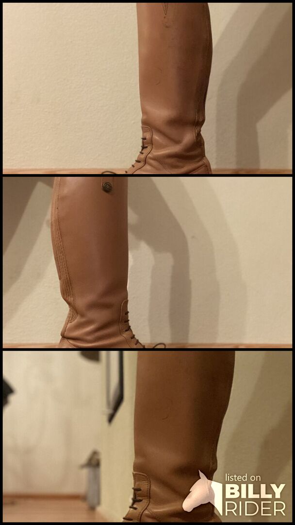Skórzane buty do jazdy konnej - Buty jeździeckie w kolorze koniakowym marki HKM wykonane z prawdziwej skóry z niewielkimi śladami zużycia po wewnętrznej stronie i na palcach butów, krótki nosek o wymiarach: wysokość:42cm i obwód łydki: 38,5cm, zamek błyskawiczny z tyłu, oryginalne opakowanie, cena pierwotna:158€