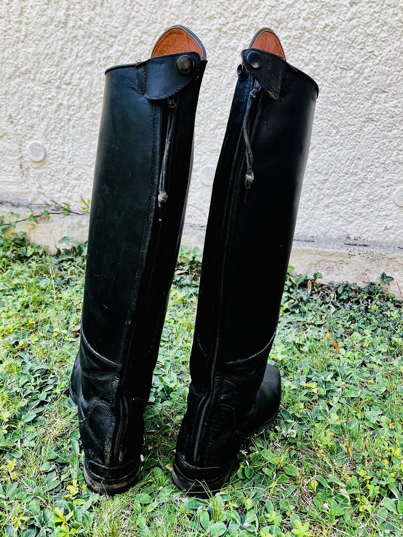 Skórzane buty do jazdy konnej - Na sprzedaż mało noszone buty jeździeckie Busse, rozmiar 41, typ Hickstead z funkcjonalnym zamkiem błyskawicznym. Prawdziwa skóra Wysłane w oryginalnym pudełku Wysokość zewnętrznej części cholewki: 54 cm Idealne dla wąskich łydek oryginalna cena 179 Euro