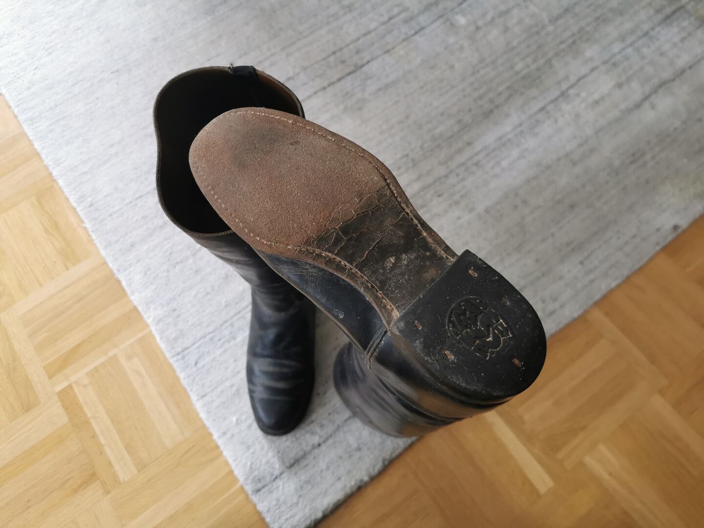 Skórzane buty jeździeckie rozmiar 38 - Sprzedaję moje stare buty jeździeckie. Skóra jest nadal w dobrym stanie, podeszwa jest zużyta. Niestety stały się zbyt ciasne na moich łydkach.