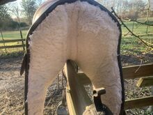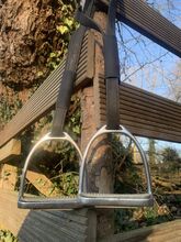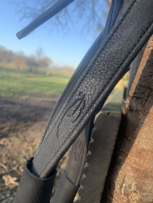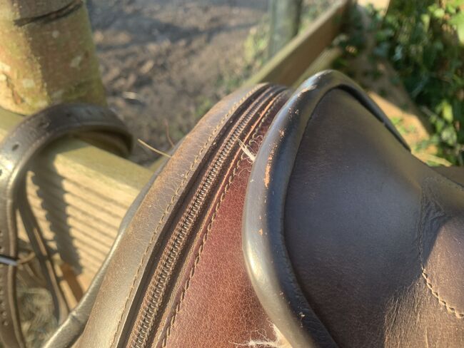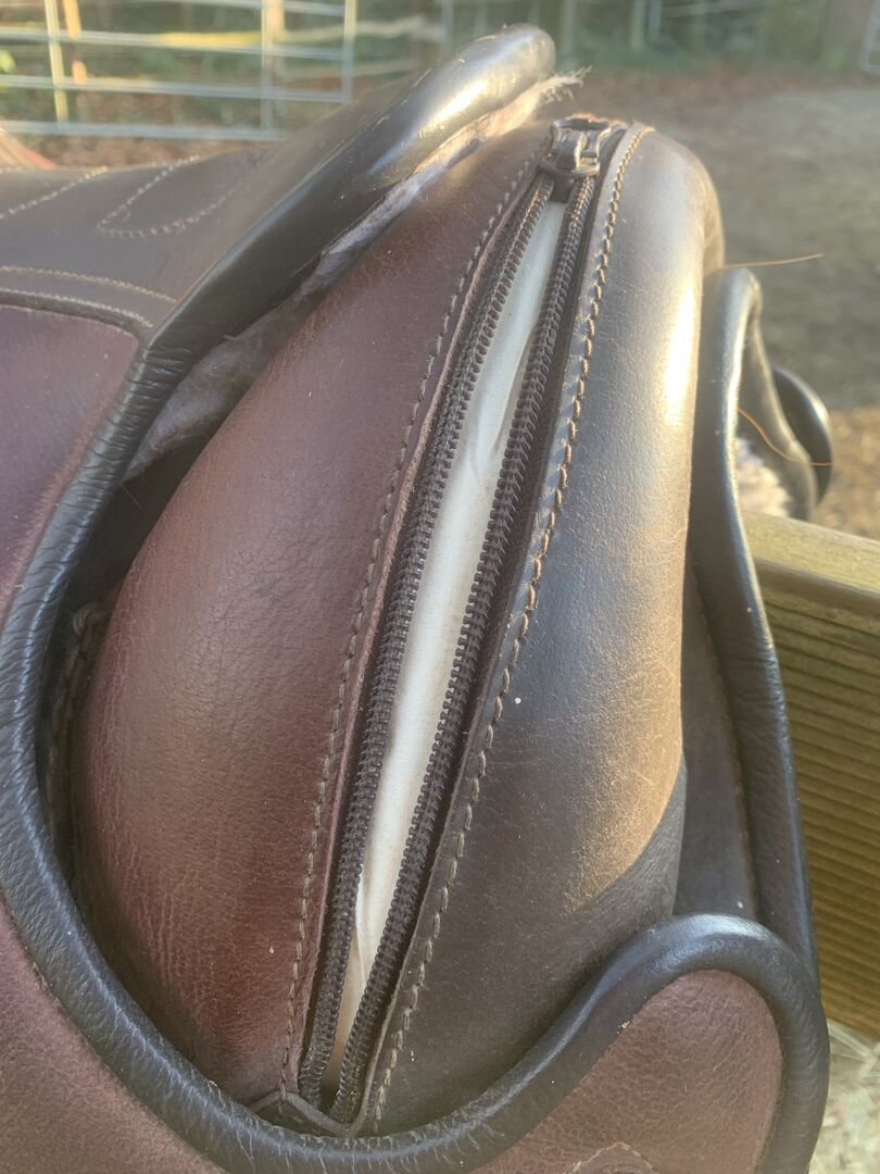Siodło jest używane, ale bardzo dobrze utrzymane i w pełni funkcjonalne. Skóra jest miękka i w dobrym stanie, z normalnymi śladami zużycia. Wszystkie zamki błyskawiczne są nienaruszone. Klin jest wykonany z tkaniny.