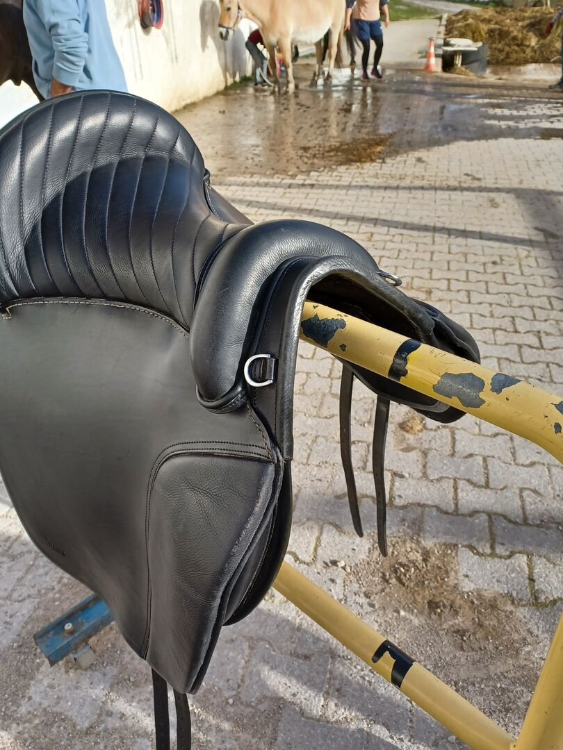 Skórzane siodło "Isabella" marki Everluck - Opis producenta: "Nasze Everluck Isabela jest częścią naszej linii premium i jest klasycznym hiszpańskim siodłem. Model ten jest również idealny dla koni z dużym kłębiem i jest idealnym wszechstronnym siodłem. Dzięki niezwykle miękko wyściełanemu siedzisku, przyjemnie wąskiemu siedzisku i rolkom kolanowym na rzepy, to siodło jest idealne do wszystkich rodzajów jazdy rekreacyjnej. Idealnie nadaje się do gimnastyki na arenie jeździeckiej (nawet z małymi skokami), a także do długich przejażdżek crossowych. Pętle (D-ringi i karabińczyki) są przymocowane do końca siodła, dzięki czemu strzemiona można starannie zawiesić bez zarysowania siodła, a torby na siodło lub podobne przedmioty można również łatwo przymocować. Nowa cena od 2500 €" Siodło zostało zakupione jako nowe latem 2022 roku i nosi niewielkie ślady użytkowania. Dzięki skórzanemu łękowi siodło łatwo dopasowuje się do grzbietu każdego konia.