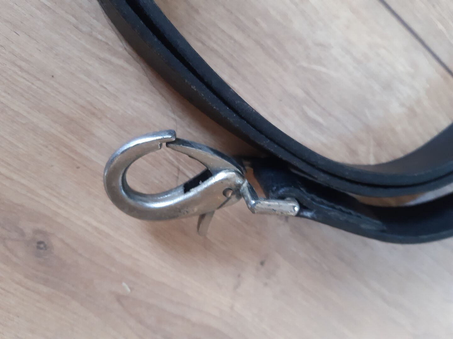 Skórzane strzemiona w kolorze czarnym - Czarne strzemiona z gumowymi odbojnikami i zatrzaskami. Grawerowany jest rozmiar Full (warmblood). Wymiary są następujące: - 27 cm od przodu do gumowego pierścienia wraz z zatrzaskiem - najdłuższy otwór 125 cm - najkrótszy otwór 110cm (10 otworów oryginalnie ponumerowanych) - najkrótszy otwór z własnymi otworami łącznie 90cm (inaczej były za długie dla mojego Norwega) Całkowita długość zawsze łącznie z zatrzaskiem i paskiem.