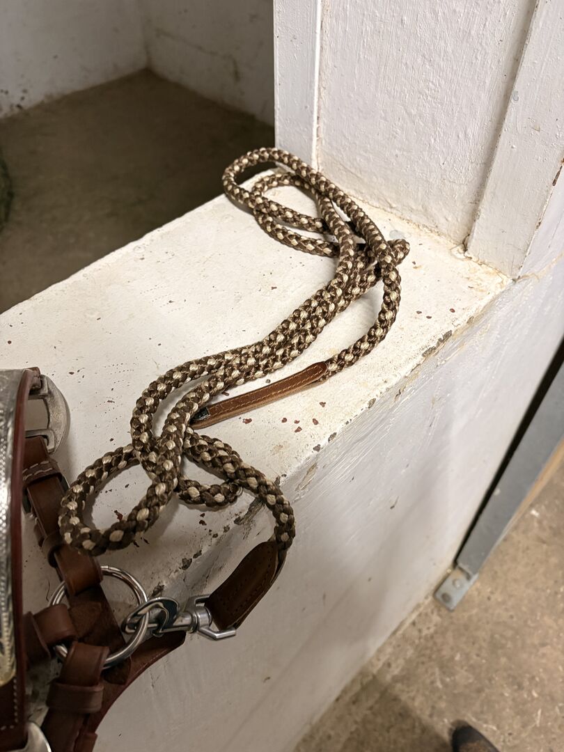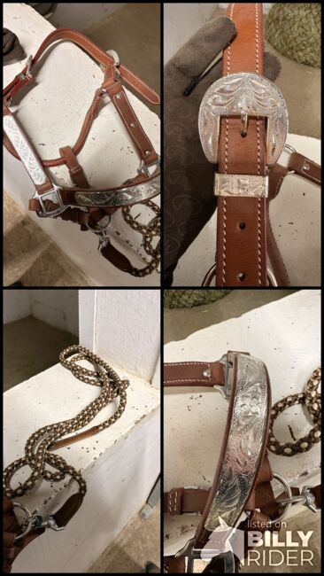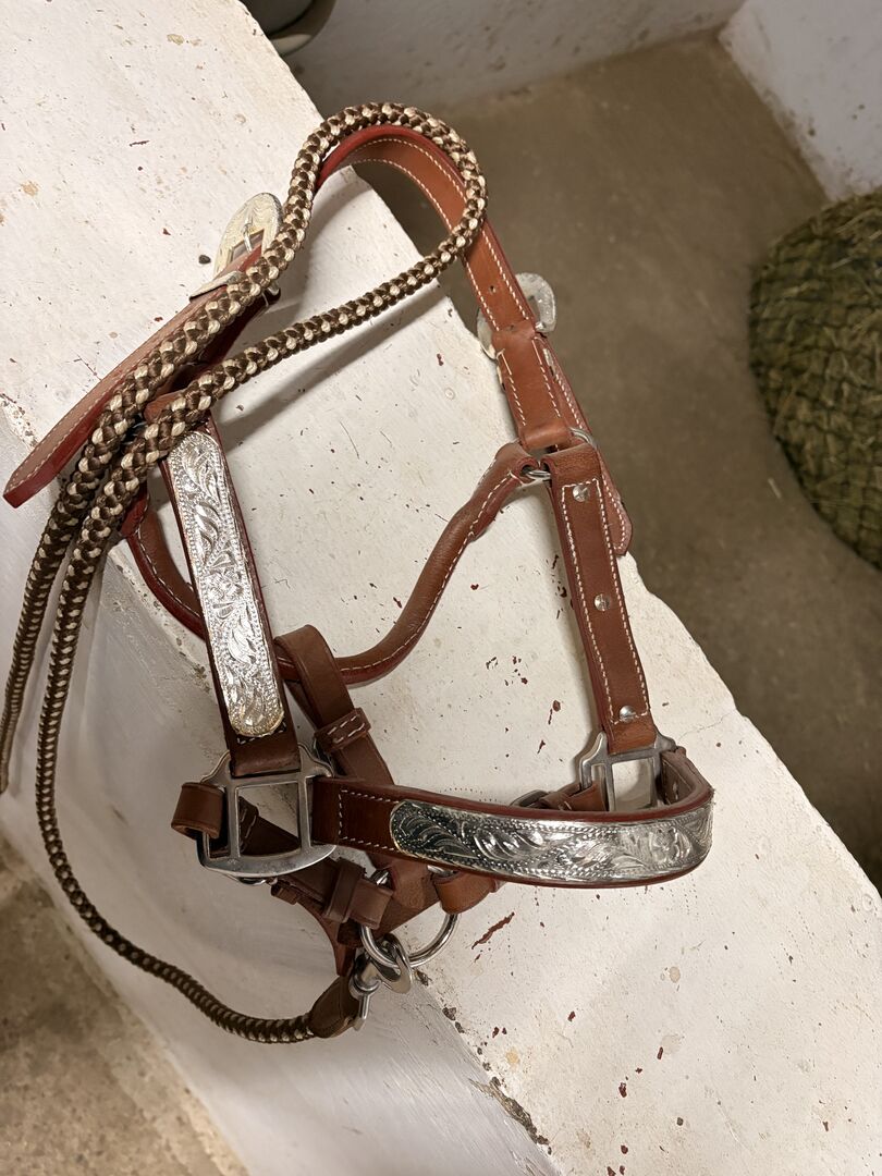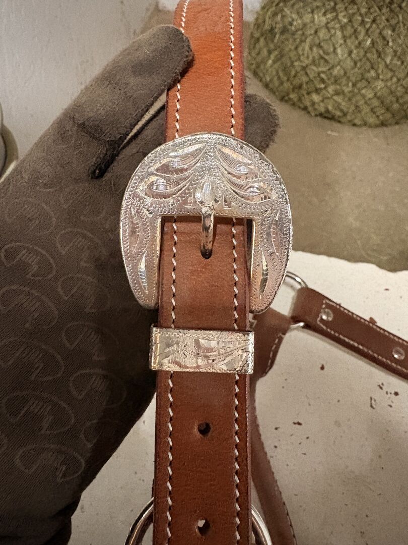Kantar nigdy nie był używany i jest w idealnym stanie: - Szlachetna brązowa skóra ze srebrnymi zdobieniami - Rozmiar: Kucyk - Wysokiej jakości wykonanie z metalowymi okuciami - W zestawie pasujący łańcuszek - Idealny na pokazy i specjalne okazje