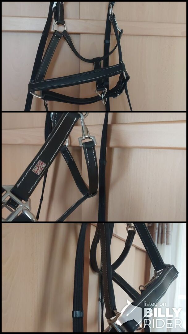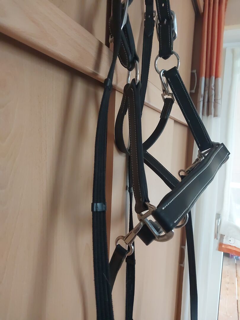 Skórzany kantar z eleganckim noskiem - 45 Euro z wysyłką, stała cena Rozmiar Full/ Warmblood Nowy bez wad Elegancki, klasyczny skórzany halter z ozdobnymi przeszyciami w kolorze kremowym. Miękka skórzana wyściółka na nagłówku i pasku na nos zapewnia maksymalny komfort. Może być regulowany dwukrotnie na nagłówku i łatwo na pasku pod brodą. Okucia w kolorze srebrnym.