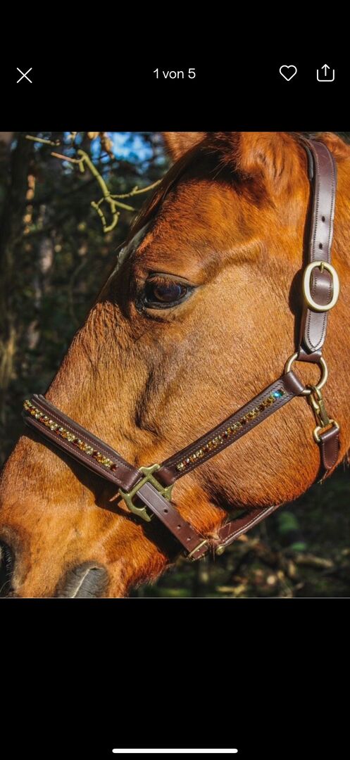 Skórzany kantar z kamieniami Swarovskiego brązowy - Na sprzedaż ten piękny halter w kolorze brązowym z kamieniami Swarovskiego i złotymi zapięciami. Rozmiar Wb, ale pasuje również na VB. Jeden kamień z przodu odpadł (zdjęcie 4), poza tym wszystkie są nadal włączone. Możliwa wysyłka. Brak zwrotu lub gwarancji jako sprzedaż prywatna! Płatność przez Paypal