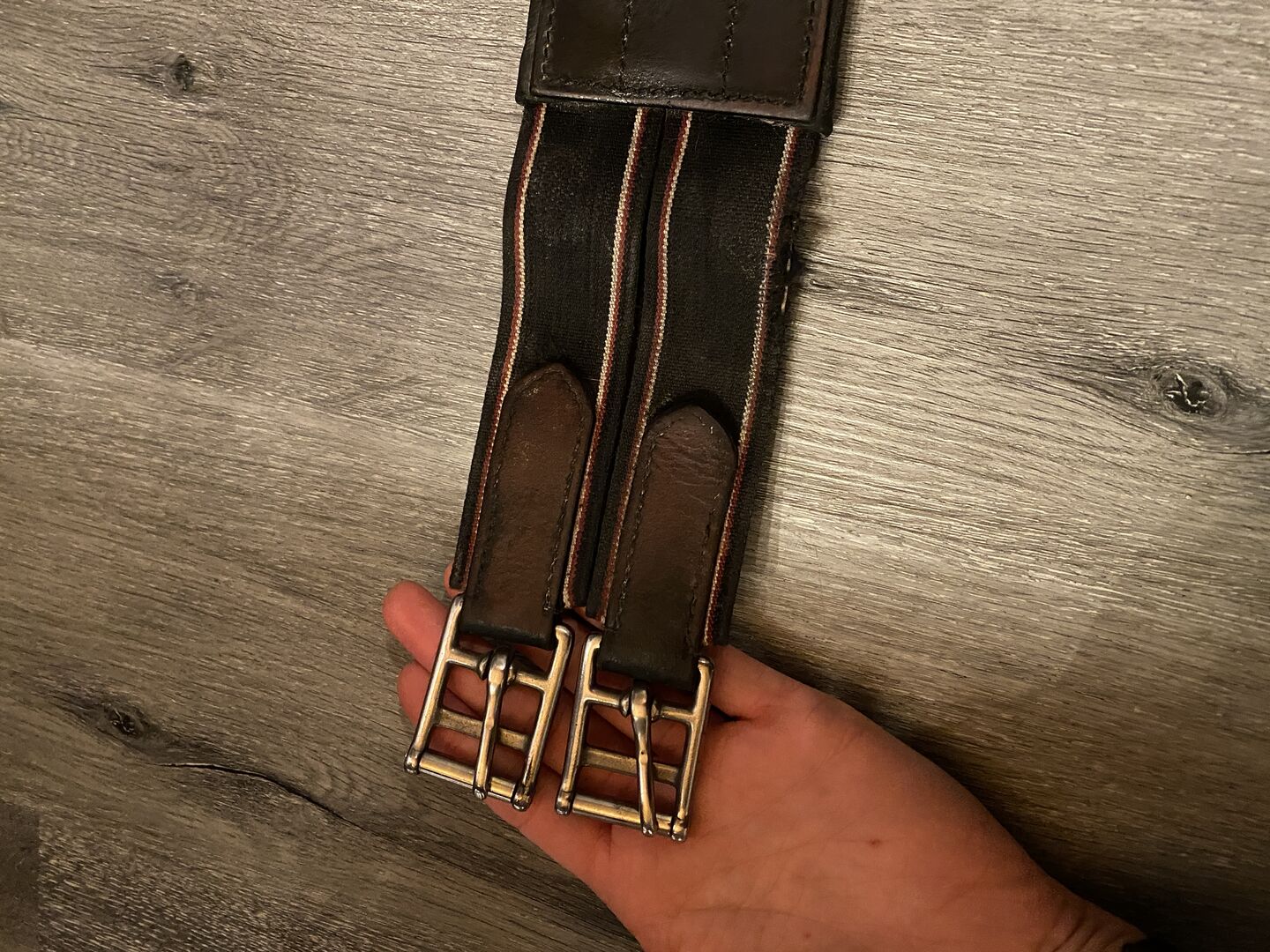 Skórzany pas do siodła 110 - Sprzedaję używany, ale wciąż w dobrym stanie skórzany girlanda. Posiada elastyczne wstawki po obu stronach, co ułatwia ponowny poród. Sam girth jest czarny, skórzane paski na klamrach są brązowe. Ale ponieważ nie widać ich pod klapą siodła, nigdy mi to nie przeszkadzało. Jeśli Ci to przeszkadza, możesz zmienić kolor za pomocą barwnika do skór. Pas posiada 3 pierścienie typu D.