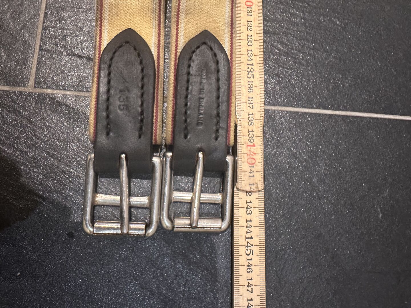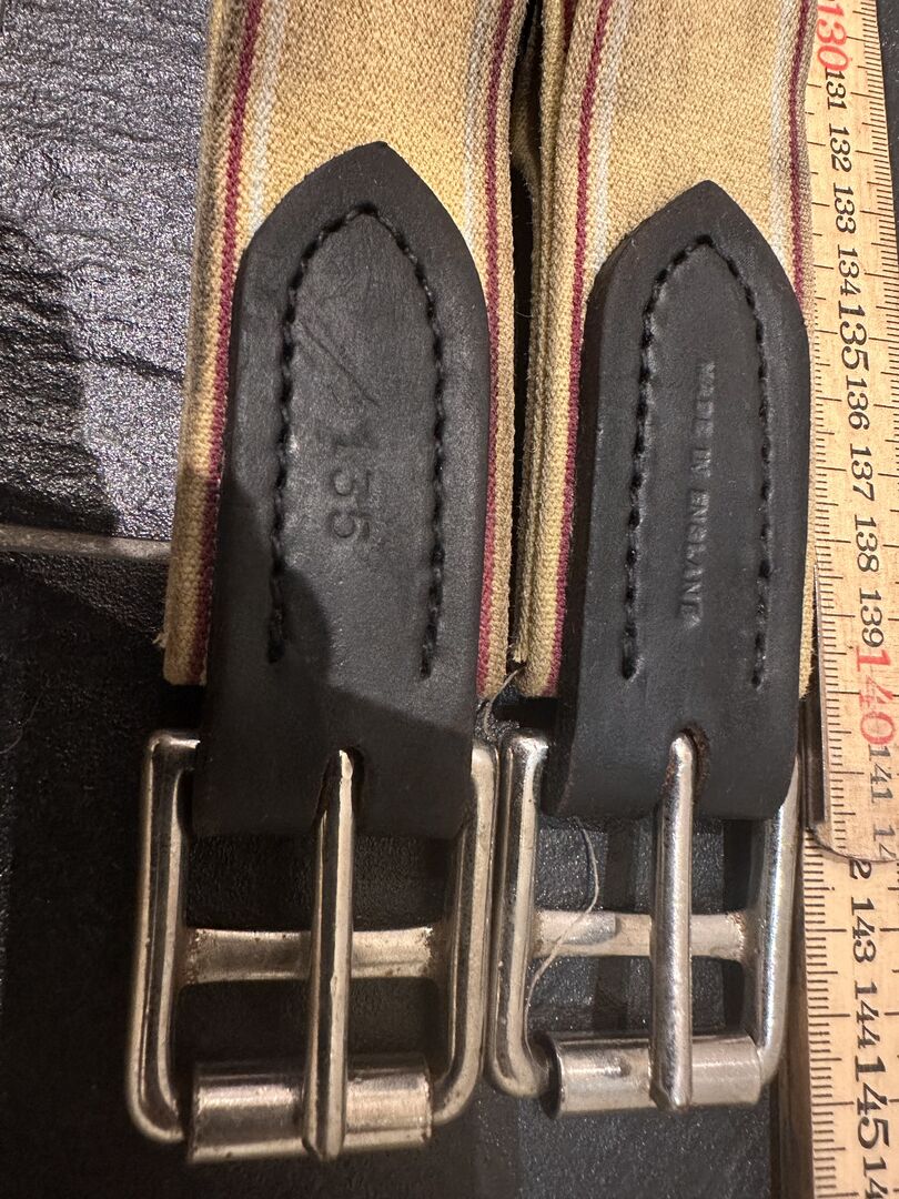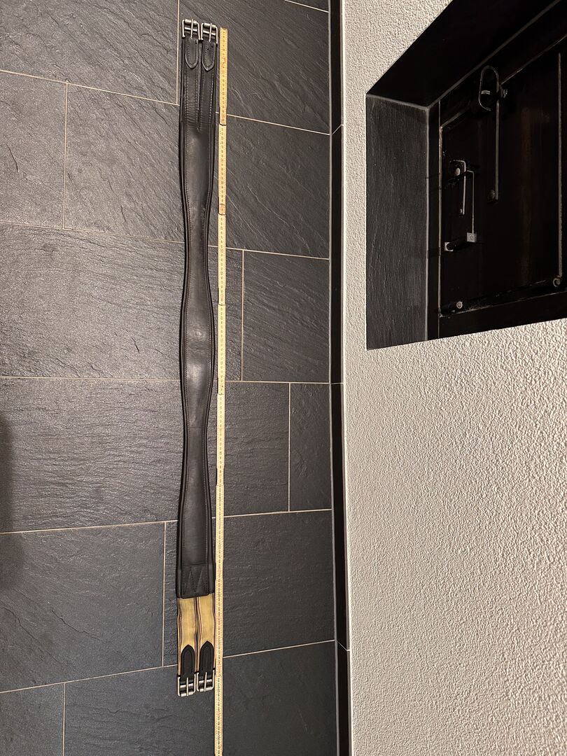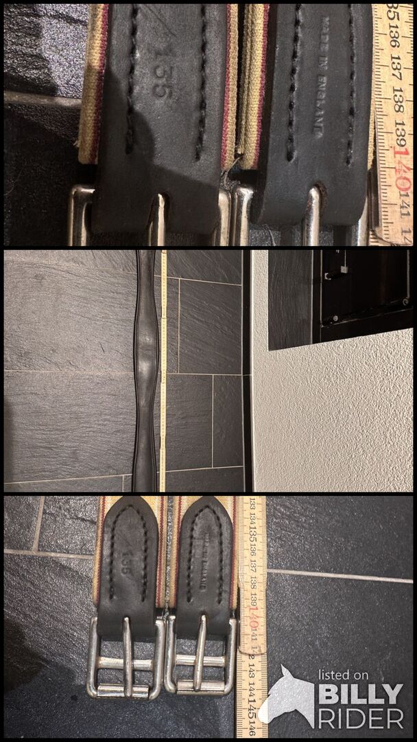 Skórzany popręg siodłowy 135cm - Używany skórzany popręg siodłowy, lekkie przebarwienia po wewnętrznej stronie materiałowych sprzączek Jedna strona elastyczna z mocną gumą, druga strona skórzane pętle Popręg ma 135cm, według skali inne wymiary (144cm ze sprzączkami)
