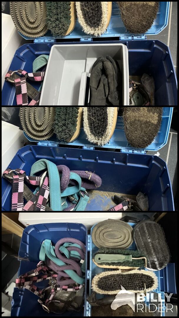 Keine Sachhaftung. Blaue Box, auch zum Draufstellen für das Pflegen große Pferde. Auch einzeln kaufbar. Box+herausnehmbares Fach siehe Bild+Putzsachen OHNE HALFTER UND STRICK OHNE HANDSCHUHE!!! Nur Putzsachen.