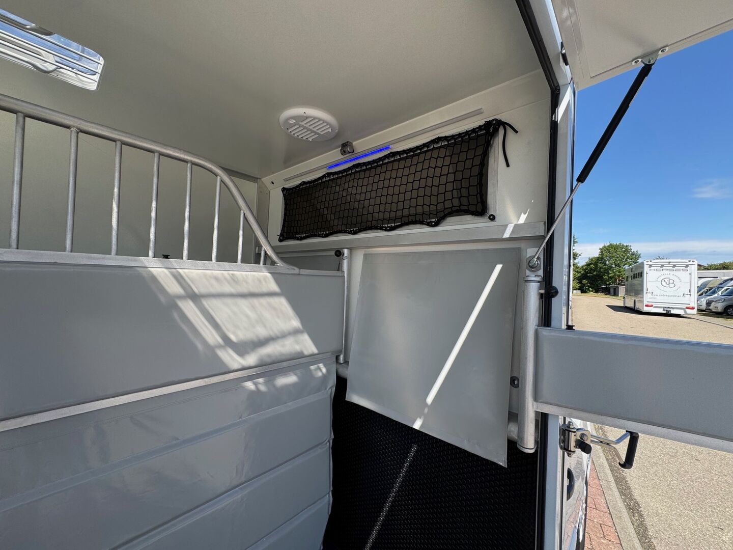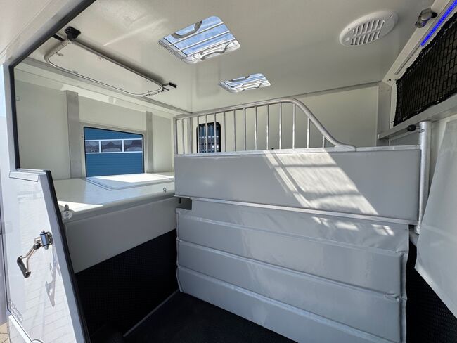 Wentylator elektryczny, 2 włazy dachowe i 2 opuszczane okna na głowach koni zapewniają dostęp powietrza i światła do przedziału dla koni. Nasz system kamer umożliwia monitorowanie koni podczas podróży i tylnej części podczas cofania. Białe i niebieskie światła LED zapewniają odpowiednie oświetlenie w dzień i w nocy.