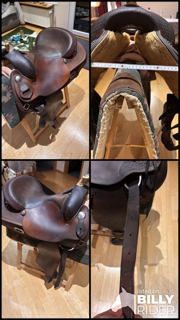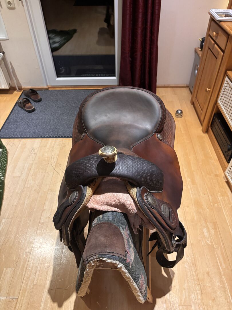 Super wygodne siodło westernowe marki "Crates", które nie jest zbyt często używane Ponieważ mój mąż i jego koń przechodzą na emeryturę, siodło jest na sprzedaż. Nie ma prawie żadnych śladów użytkowania oprócz błotników. Latigo jest również nadal dobre. Strzemiona nie wchodzą w skład zestawu. Siodło ma róg z surowej skóry. Rozmiar siedziska to 16". Jest wykonane ręcznie, a cena wynosiła 2,650 €. Z przyjemnością otrzymam realistyczne propozycje cenowe.