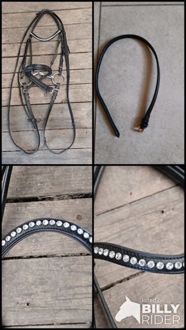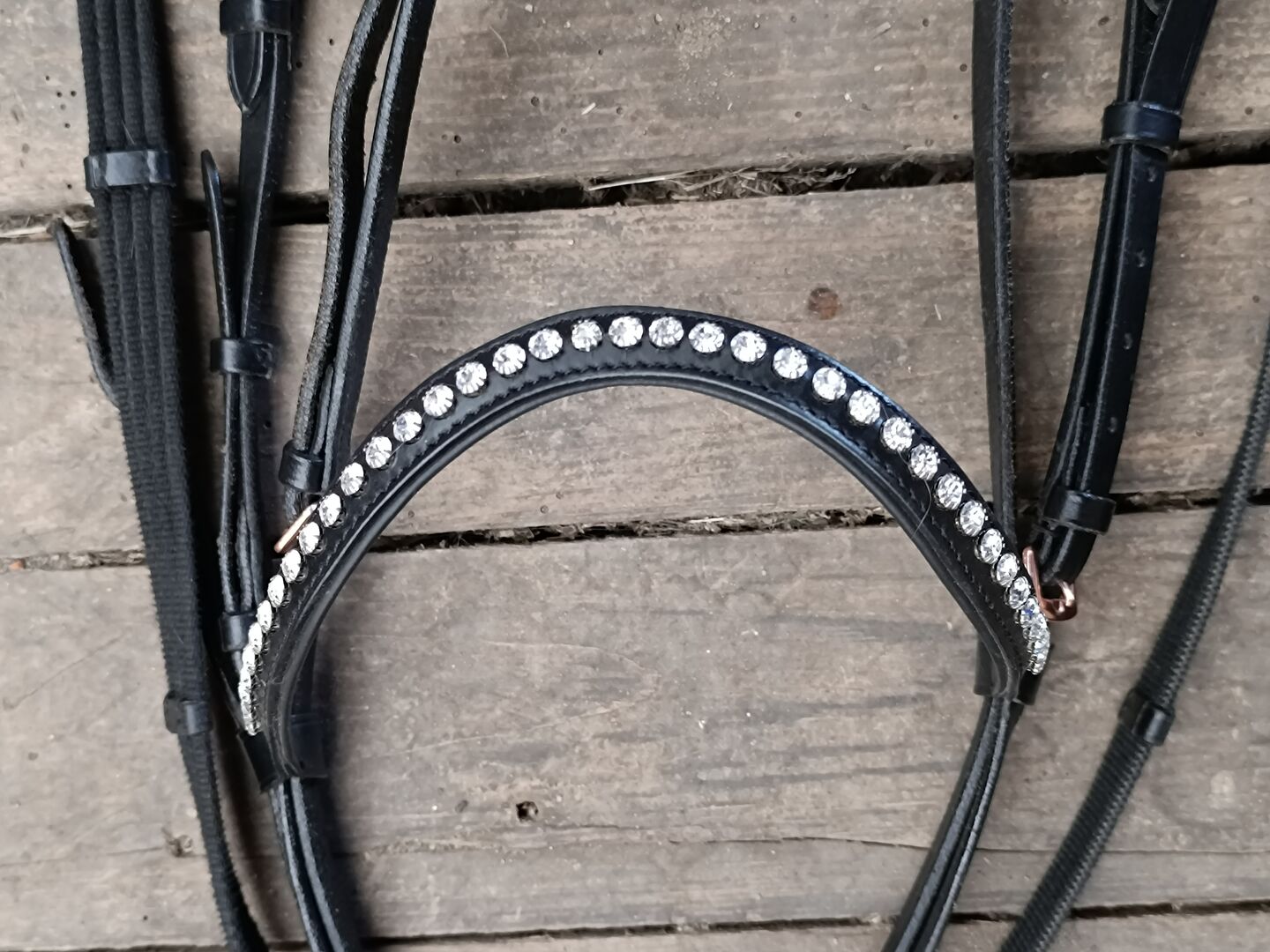 Snaffle bez gryzaka, z opaską na czoło i lejcami - Snaffle Skóra Czarny Pałąk z dżetami Karabińczyk podwójnie łamany Kolba Dostępny stopband Zostanie wyczyszczony przed wysyłką