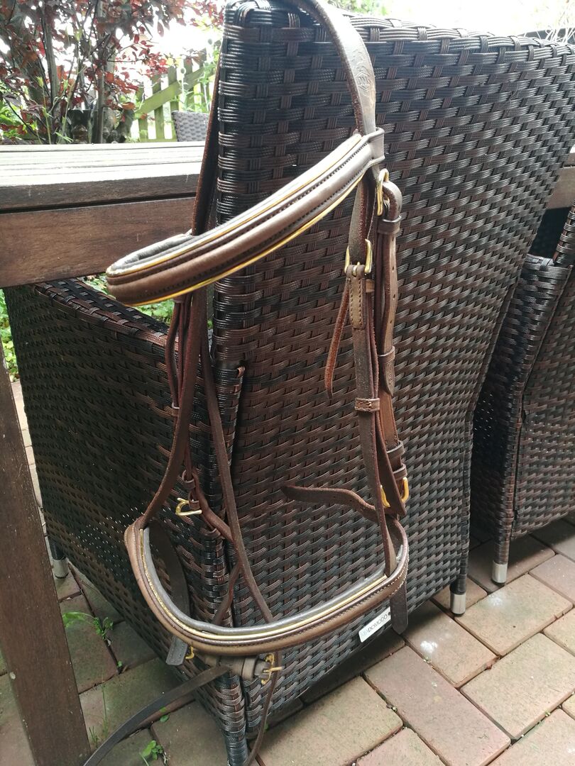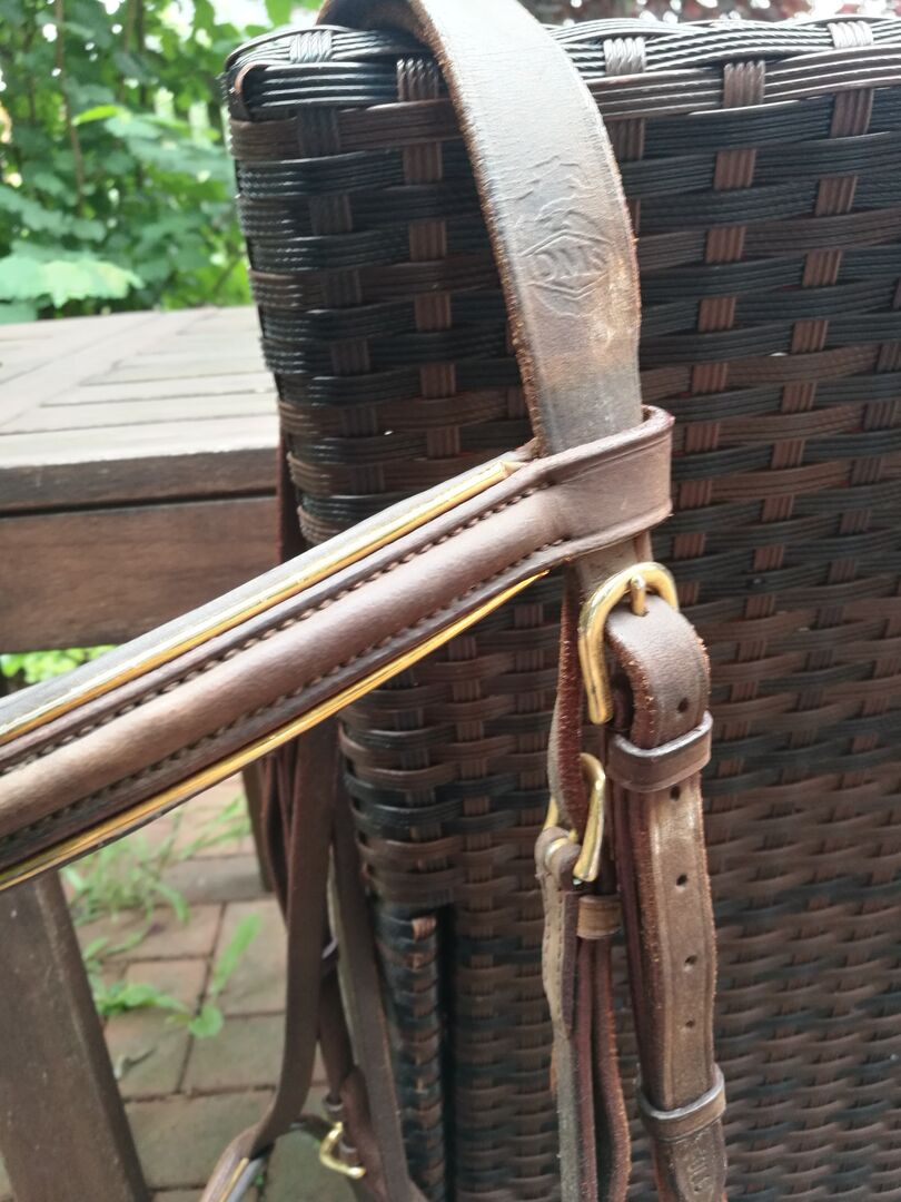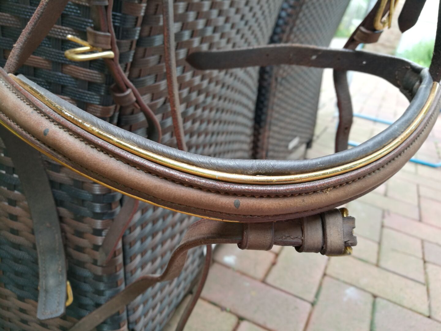Snaffle Brązowo-złoty - Sprzedaję mój angielski pasek na nos, który przyciąga wzrok. Niestety, złoto na złotych krawędziach jest już minimalnie odpryśnięte (patrz zdjęcie), ale poza tym jest w dobrym stanie. Rozmiar WB.