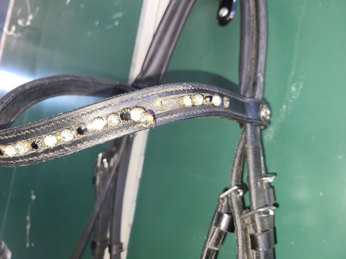 Pałąk jest uszkodzony, patrz zdjęcie. Uzda ma miękką skórę i jest czarna. Był skutecznie używany przez 2 miesiące, ponieważ stał się za mały. Niestety pasek został uszkodzony w wyniku głupiego wypadku. Ale można go łatwo wymienić. Dlatego tanio oddać. Rozmiar to Full/WB