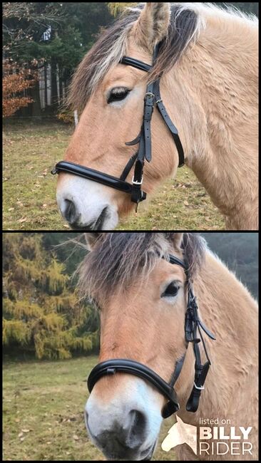 Snaffle od Kiefer - Oferuję mało używany snaffle dla koni zimnej krwi. Najszersze wymiary od paska nosowego nad siodłem do paska nosowego ok. 145-150 cm. Największy obwód paska na nos ok. 80 cm. Dalsze pomiary mogą być wysłane na życzenie.