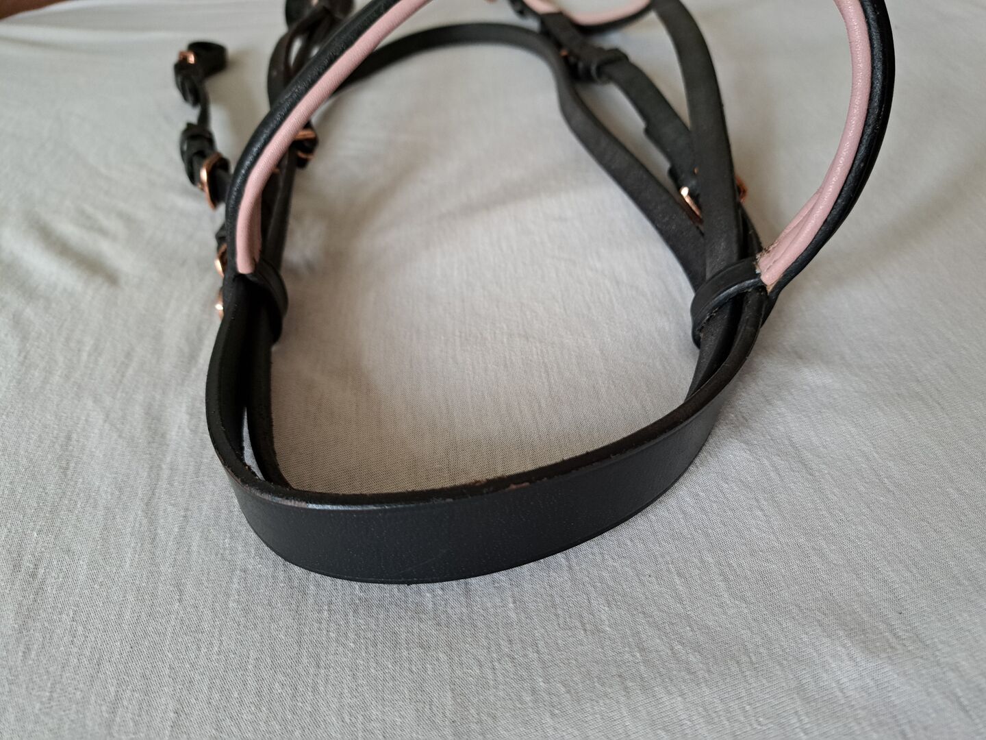 Snaffle Showmaster Pony Pink Lined - Uzda jest w dobrym stanie, nie ma wad i wygląda bardzo ładnie. Wodze są dołączone, ponieważ były używane kilka razy.